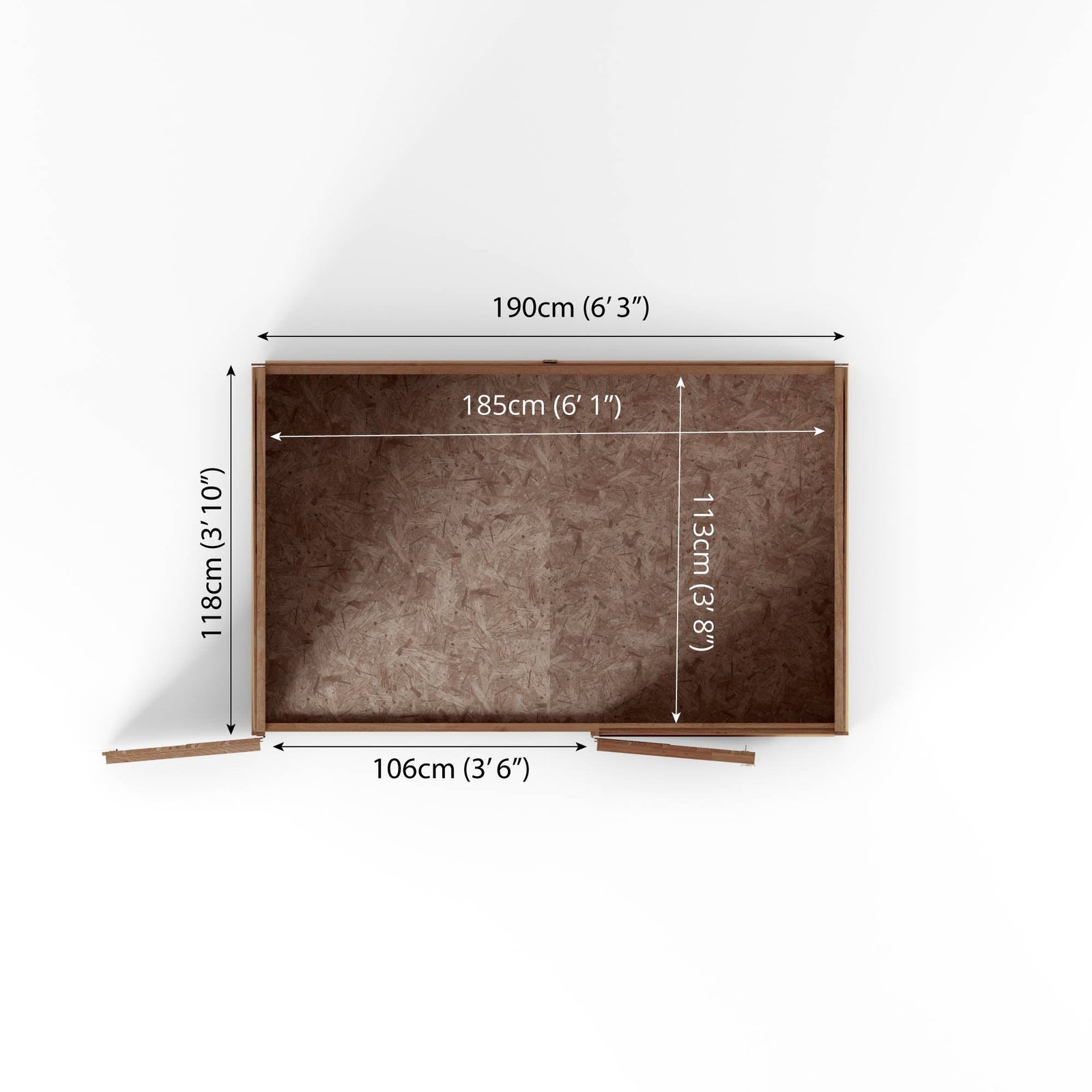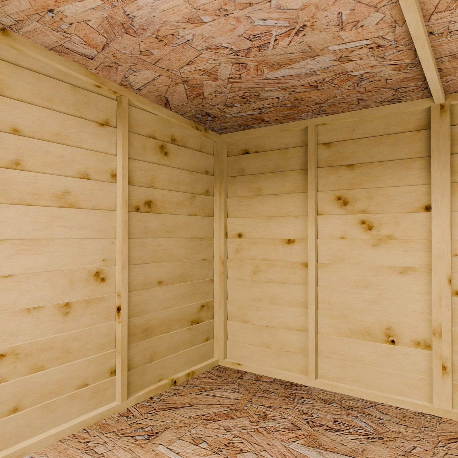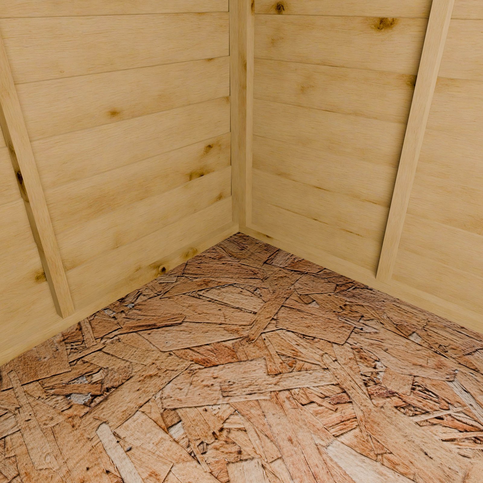 The walls of this shed are constructed using overlapping timber boards that are attached to a strong internal frame, to create durable and robust panels. This building is complete with thick wooden internal framing to support the overlap panelling, creating a rigid, long lasting structure. This shed also comes with oriented strand board (OSB) flooring and roof. This solid sheet board is manufactured from several layers of tightly compared oriented strands, ideal for every day use and general storage whilst being budget friendly.