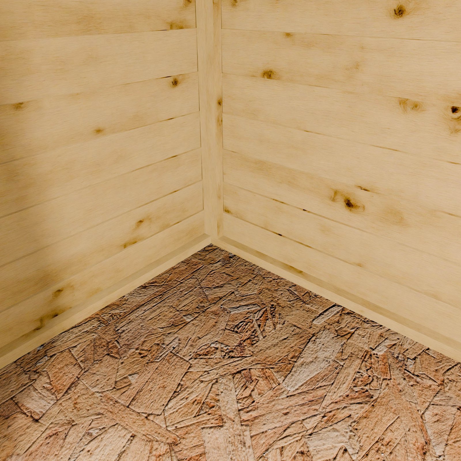 The walls of this shed are constructed using overlapping timber boards that are attached to a strong internal frame, to create durable and robust panels. This building is complete with thick wooden internal framing to support the overlap panelling, creating a rigid, long lasting structure. This shed also comes with oriented strand board (OSB) flooring and roof. This solid sheet board is manufactured from several layers of tightly compared oriented strands, ideal for every day use and general storage whilst being budget friendly.