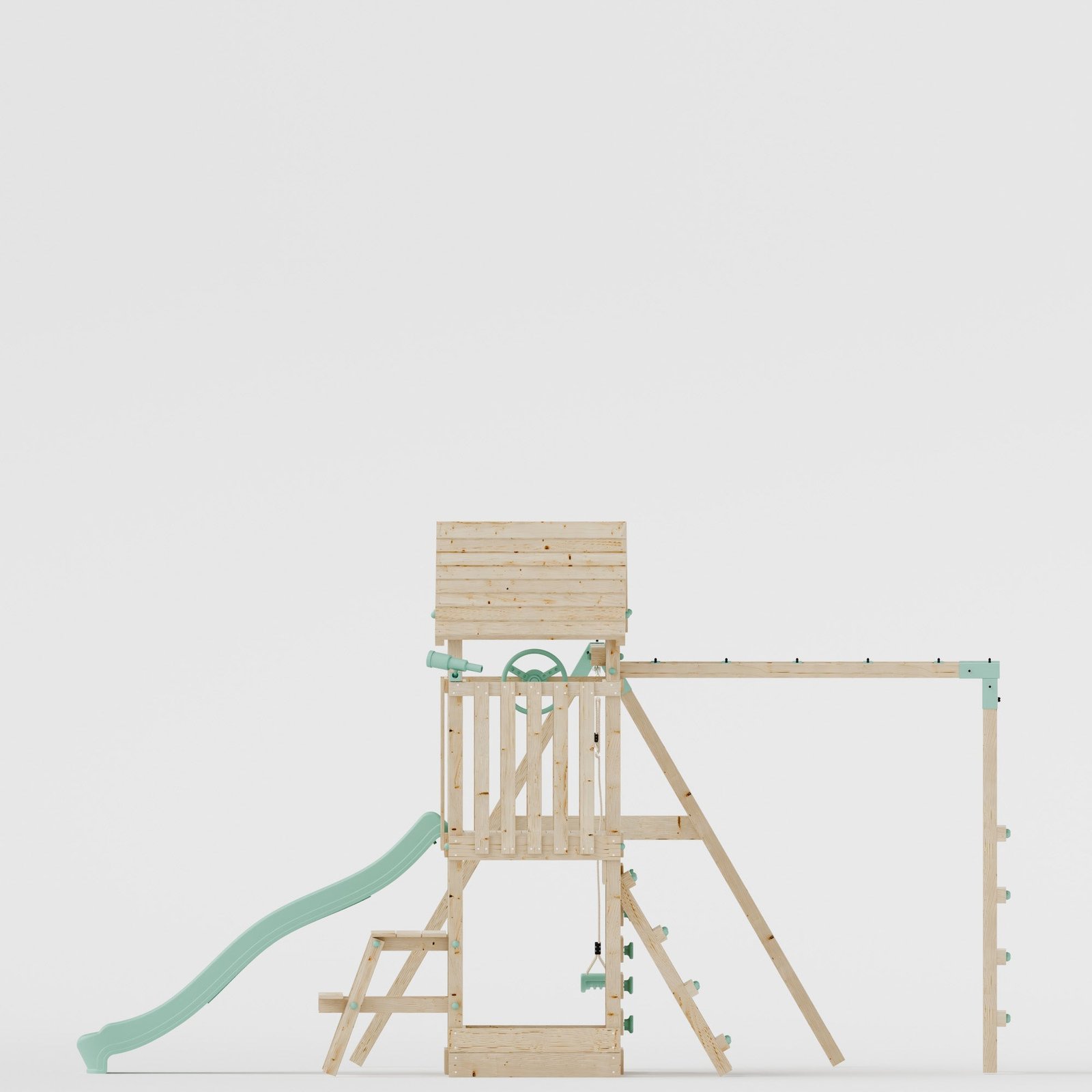 The Misty Timberlands I is equipped with a height adjustable swing, picnic area allowing for an outside lunch or imaginative play, colourful monkey bars helping to develop muscle strength and a large extended tower fully for more room to play but still equipped with a telescope and spinnable wheel.