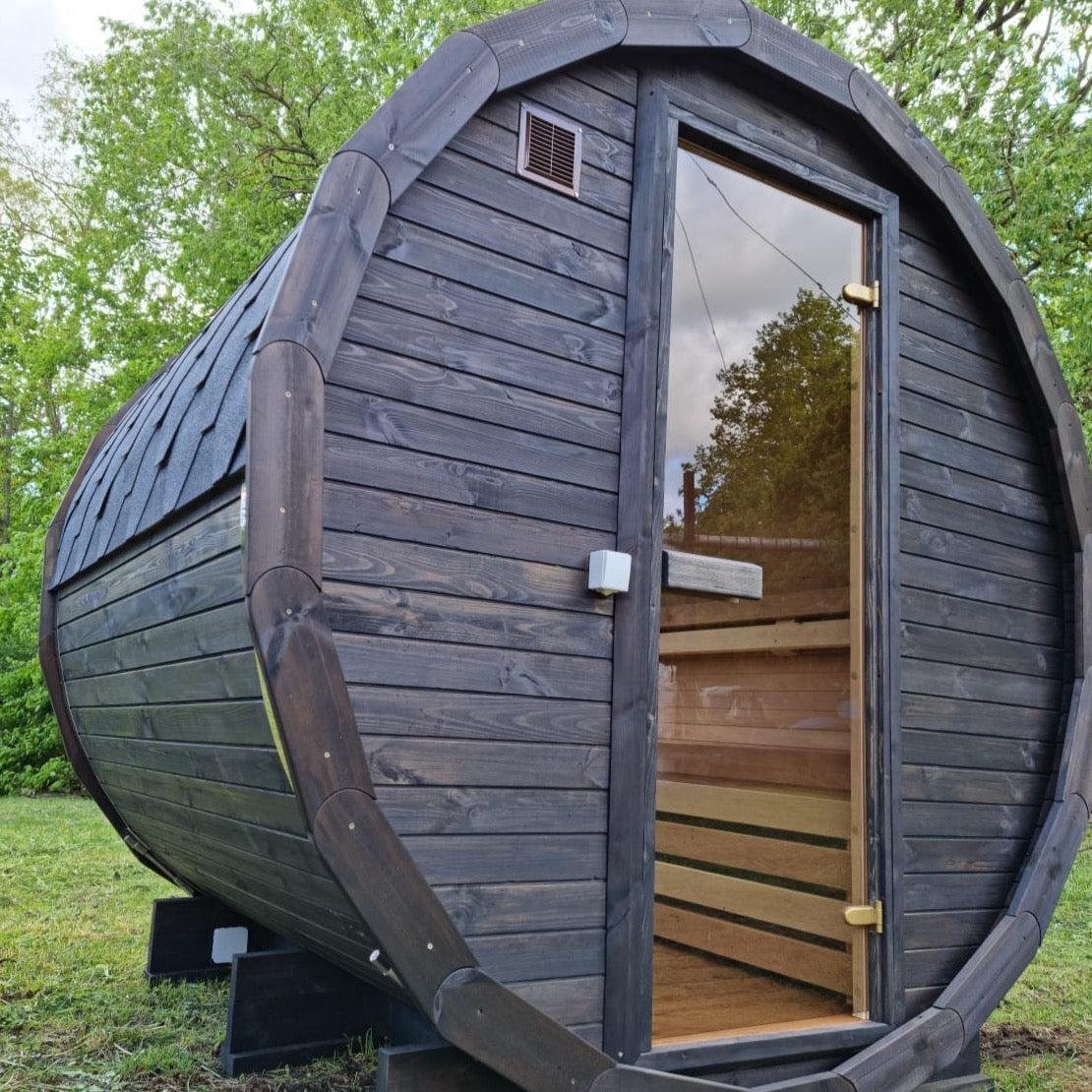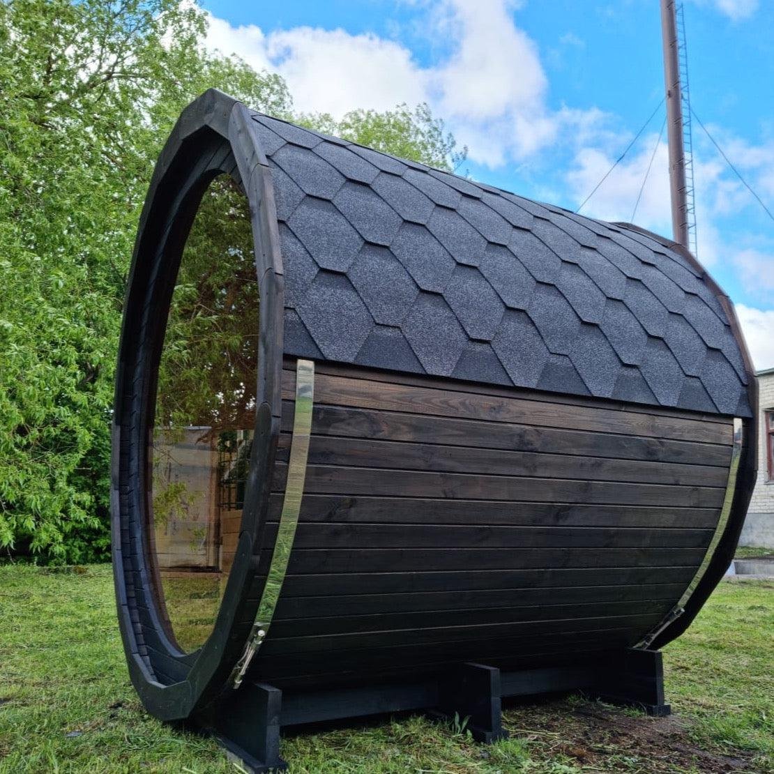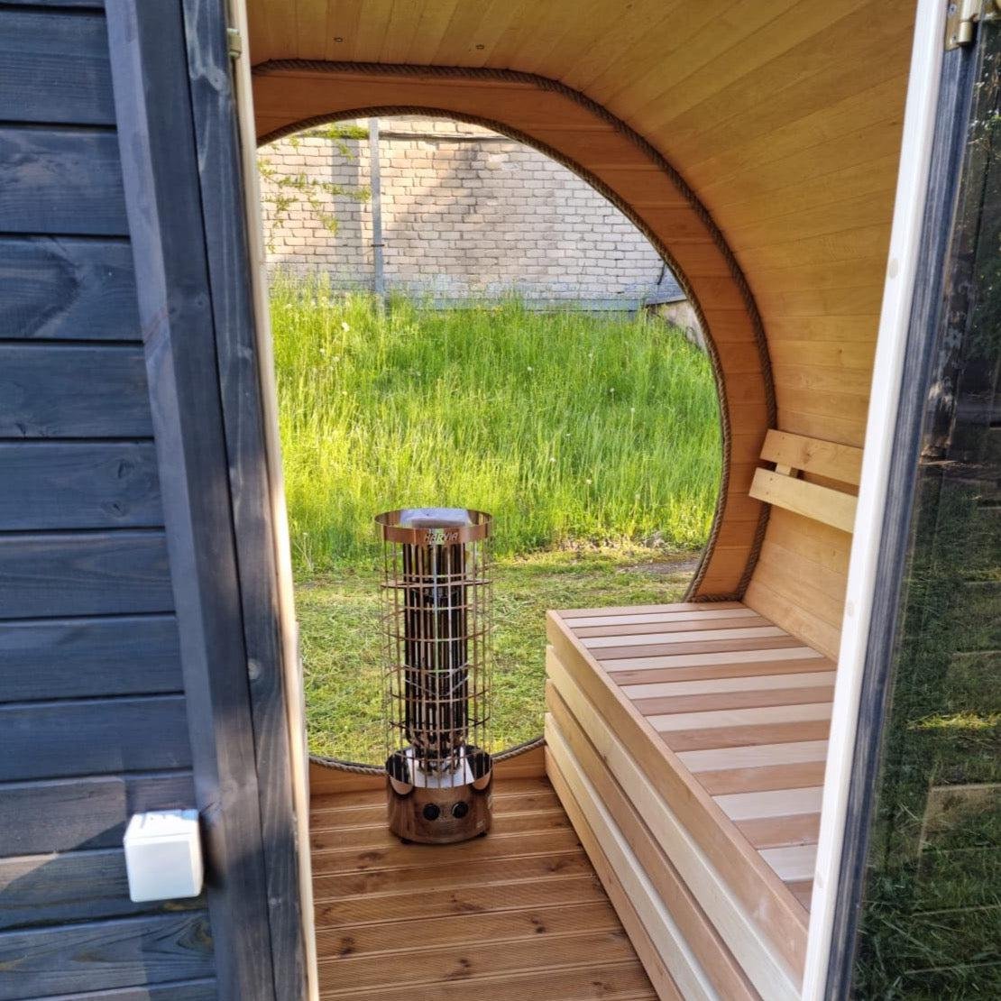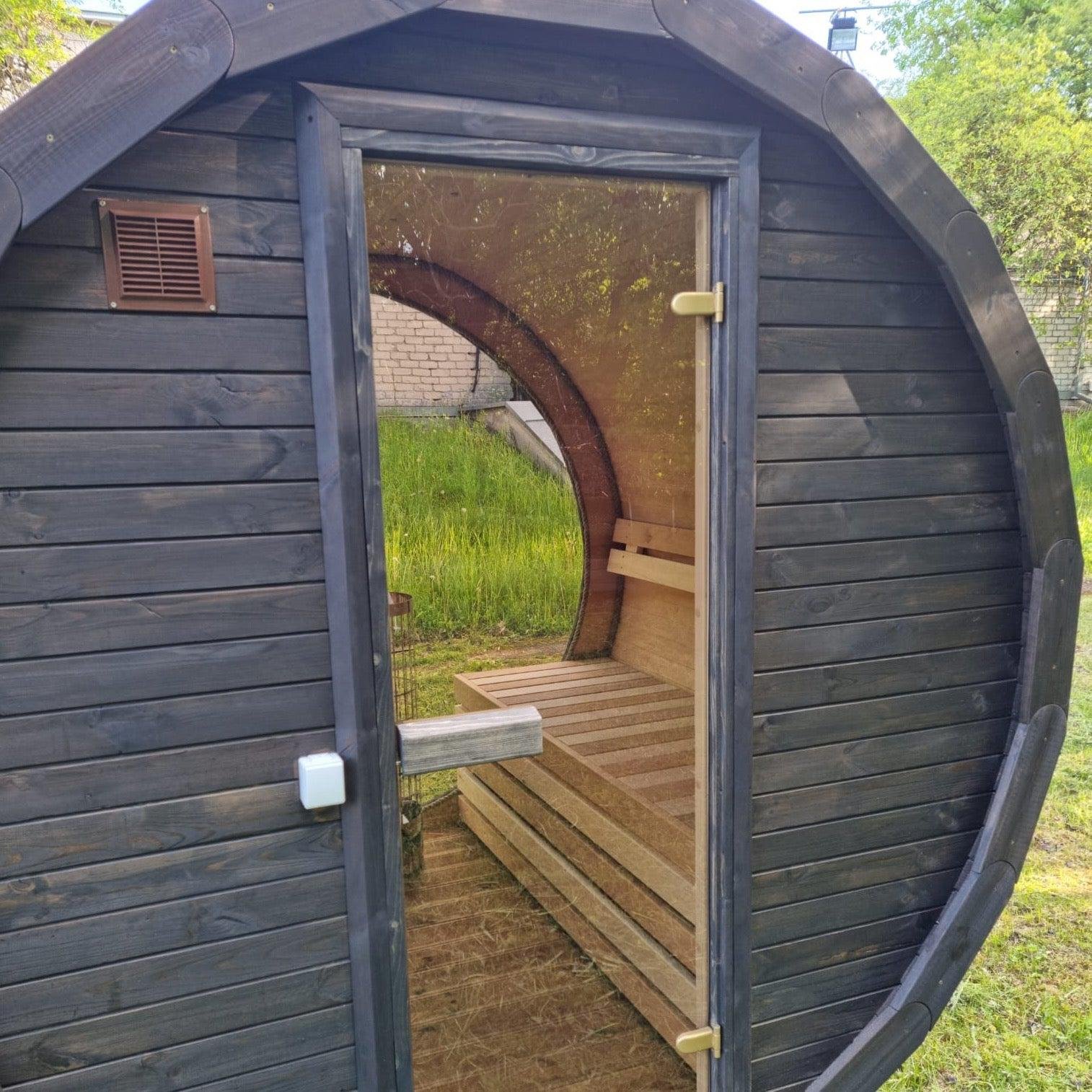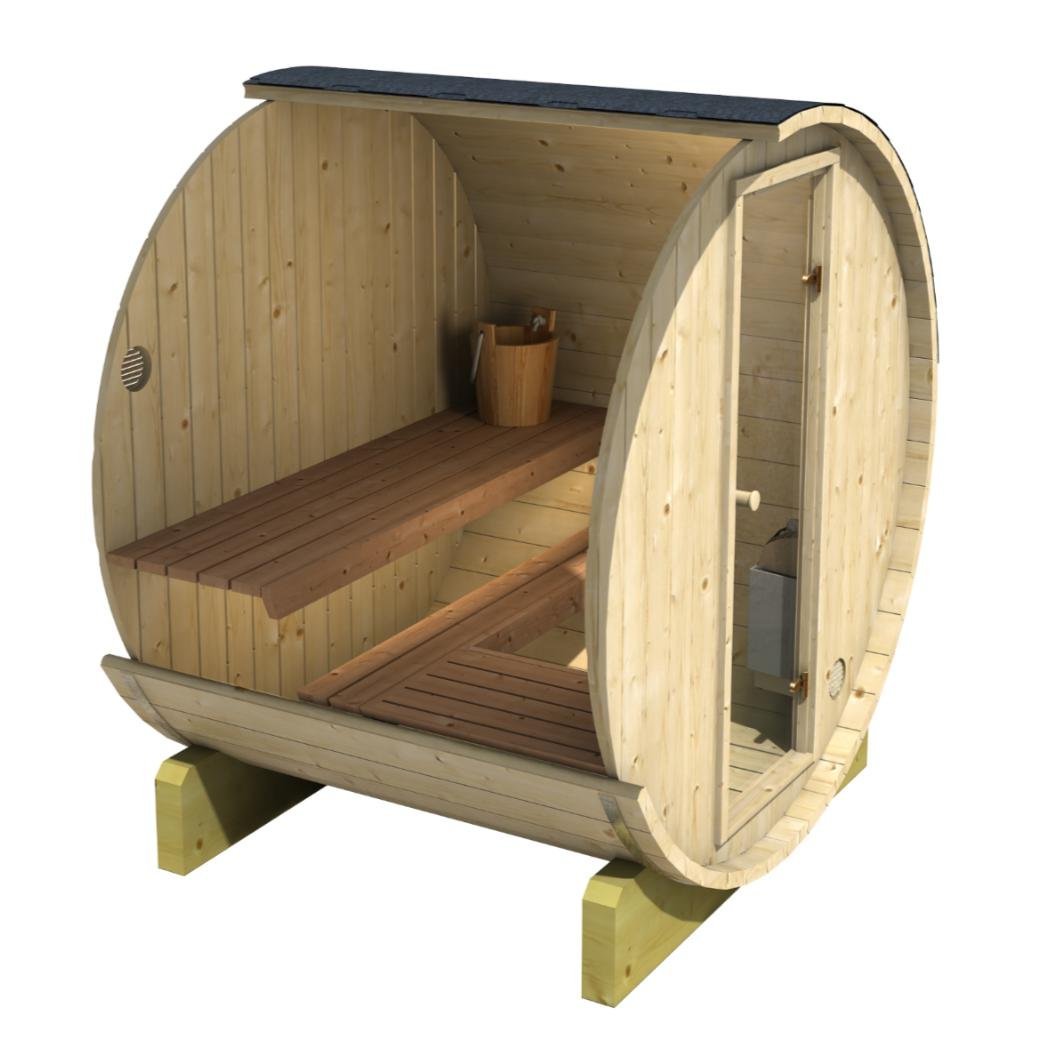 Made from sustainable Spruce timber either standard or thermo-treated (selectable in options) with roof shingles, glass door, various styles of back & front windows, Alder seating, outside terrace and wood treatment this is truly a wonderful sauna. Simplistic in design and very affordable.