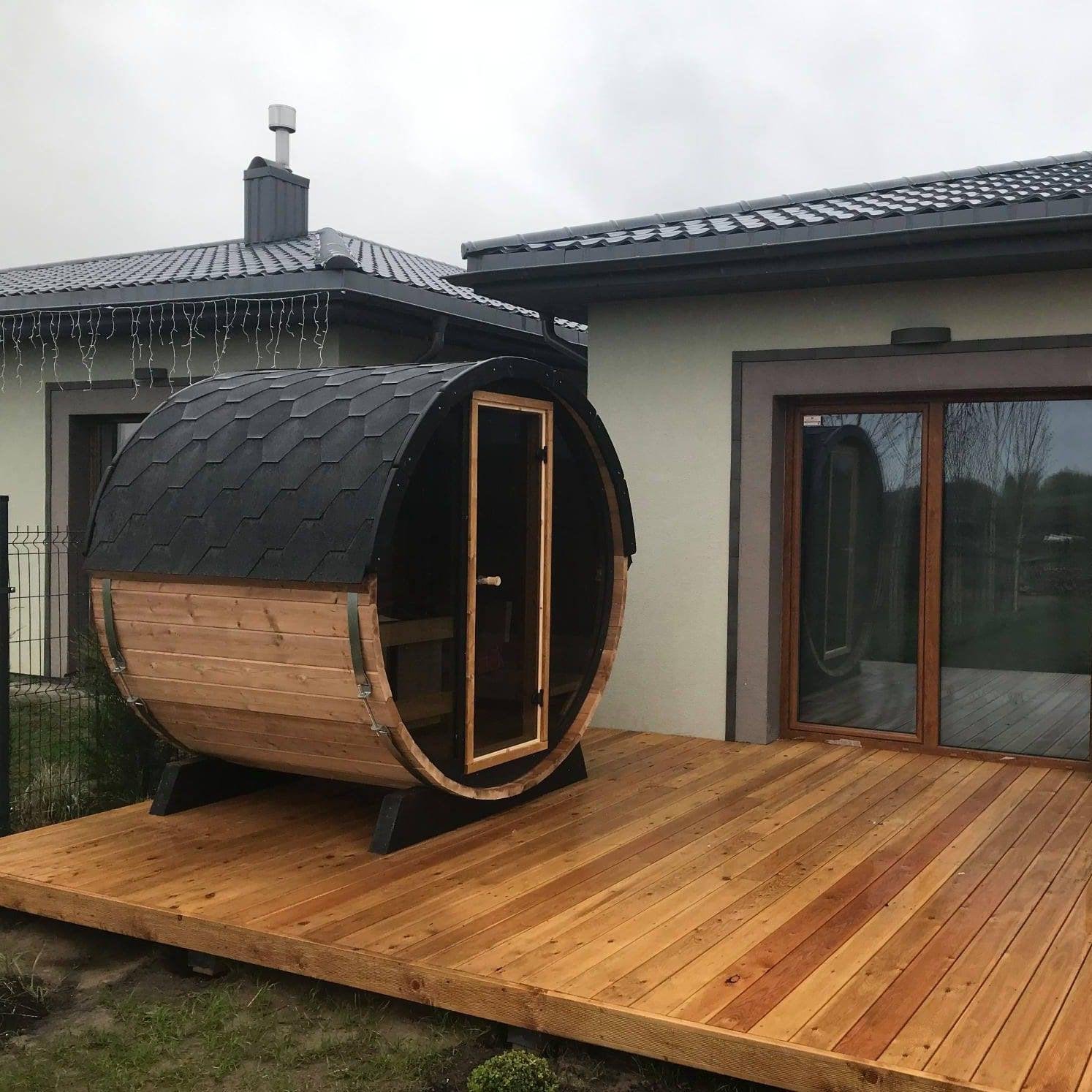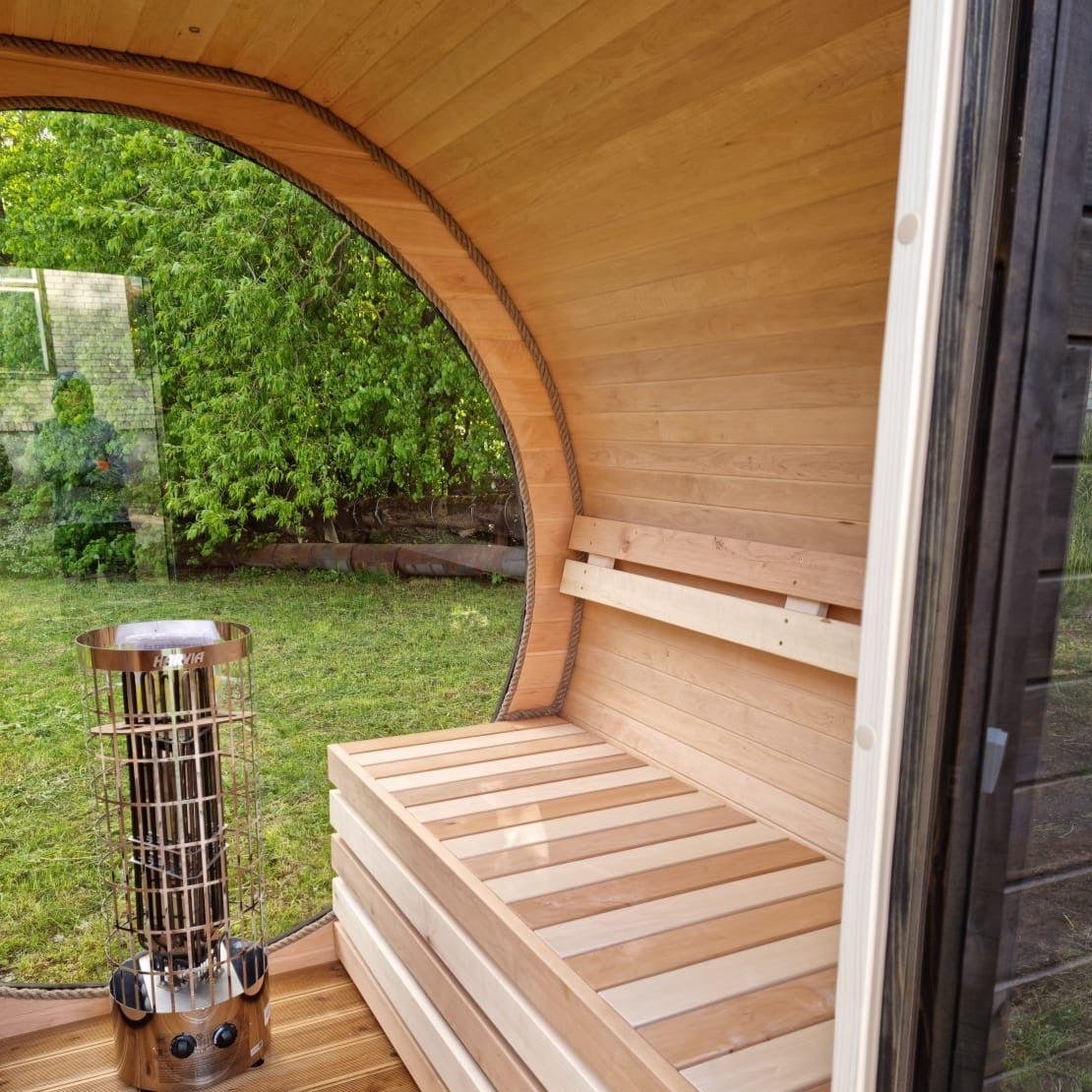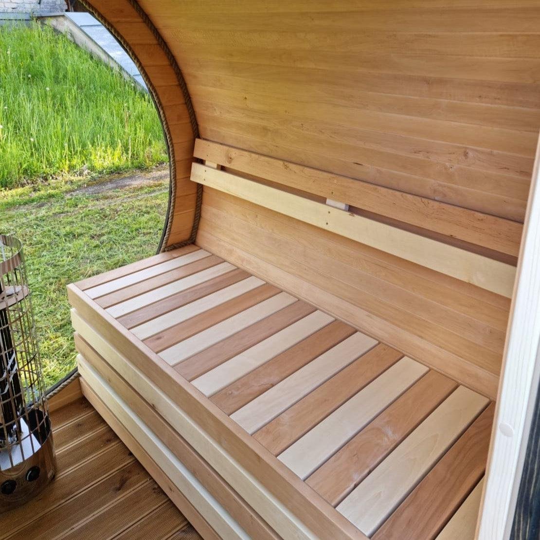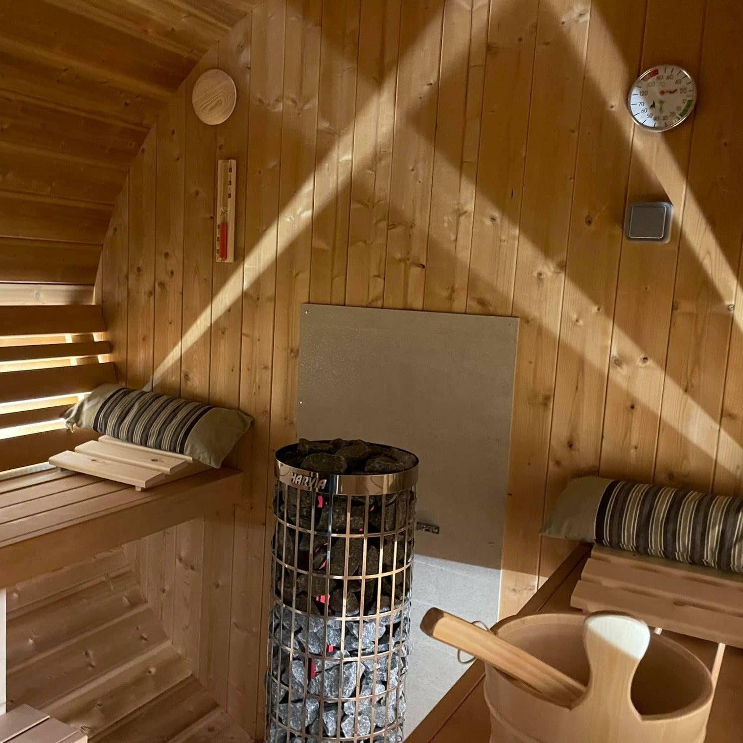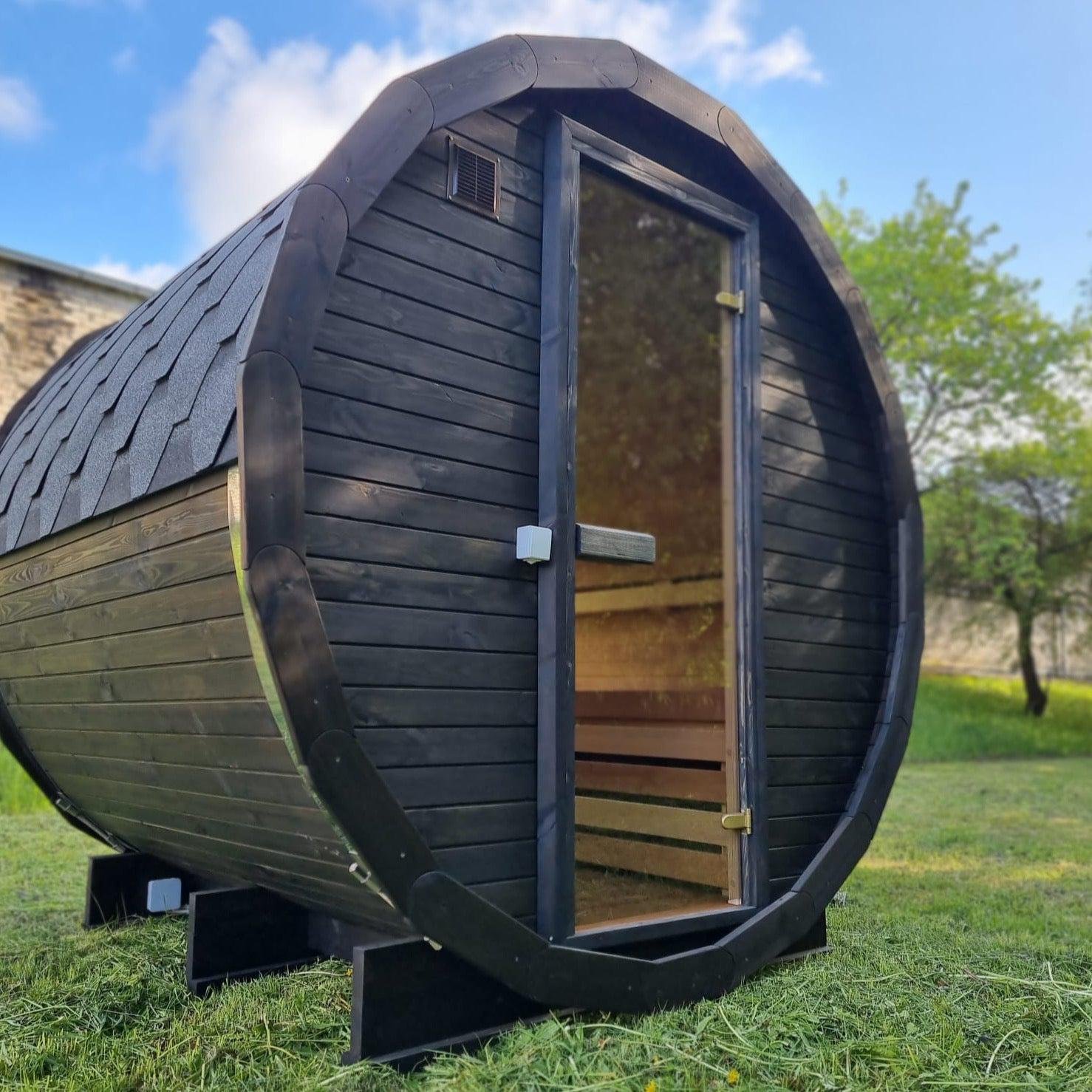Made from sustainable Spruce timber either standard or thermo-treated (selectable in options) with roof shingles, glass door, various styles of back & front windows, Alder seating, outside terrace and wood treatment this is truly a wonderful sauna. Simplistic in design and very affordable.