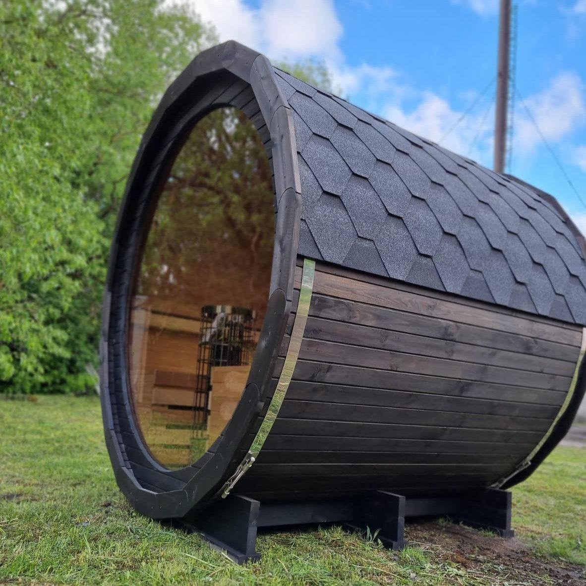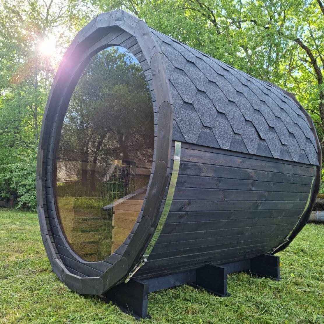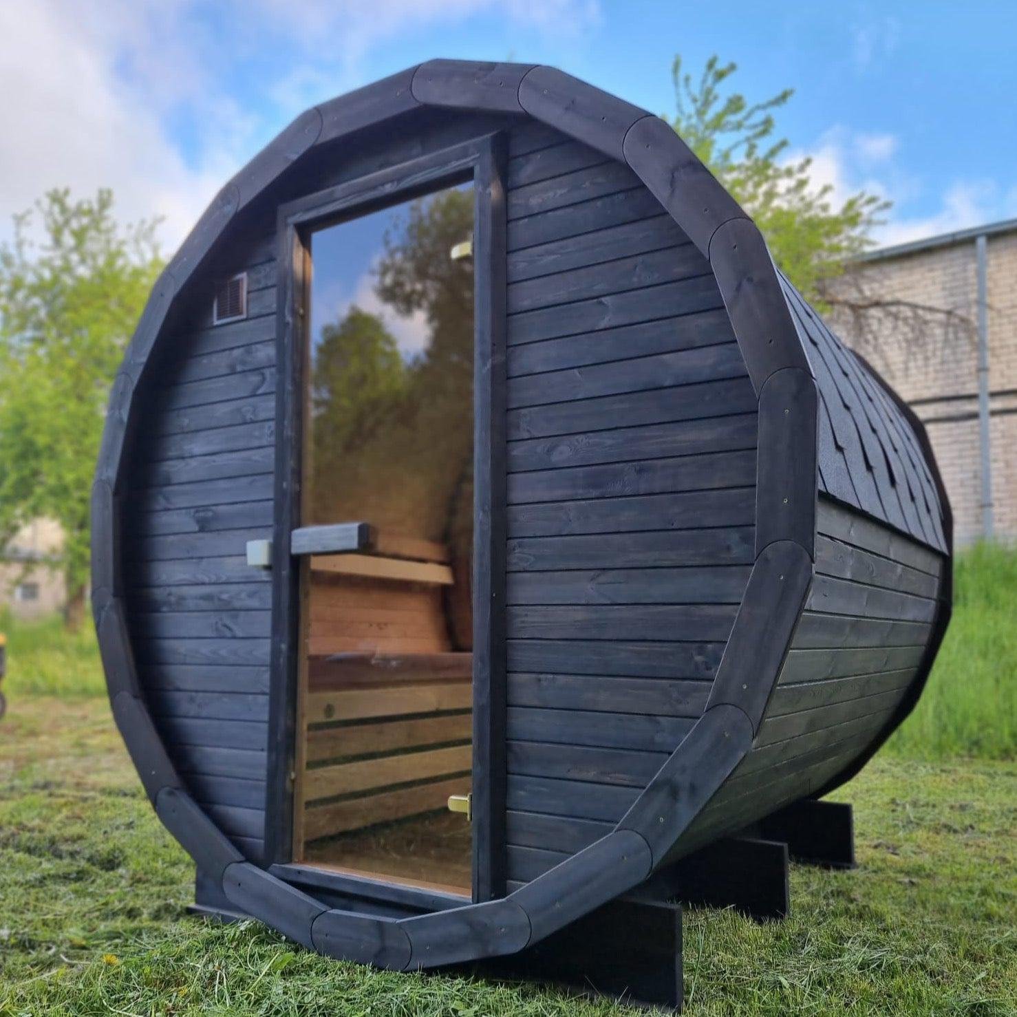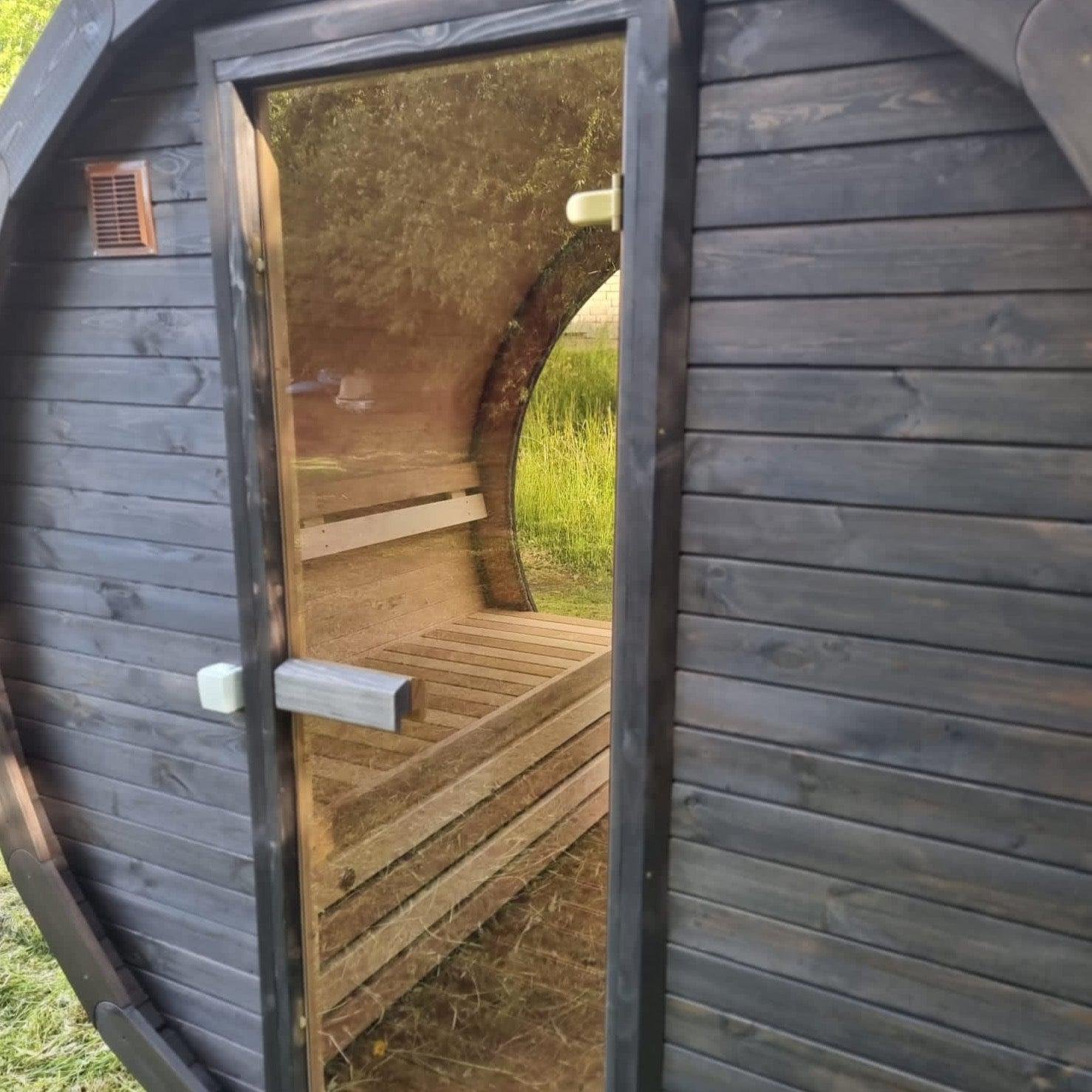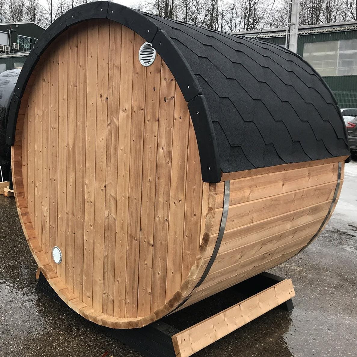 Made from sustainable Spruce timber either standard or thermo-treated (selectable in options) with roof shingles, glass door, various styles of back & front windows, Alder seating, outside terrace and wood treatment this is truly a wonderful sauna. Simplistic in design and very affordable.