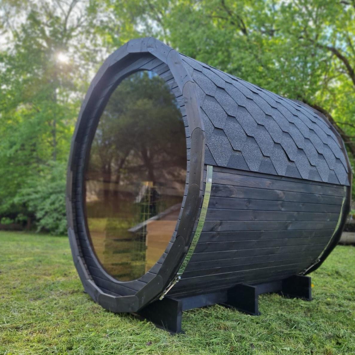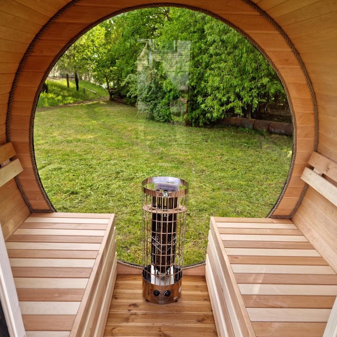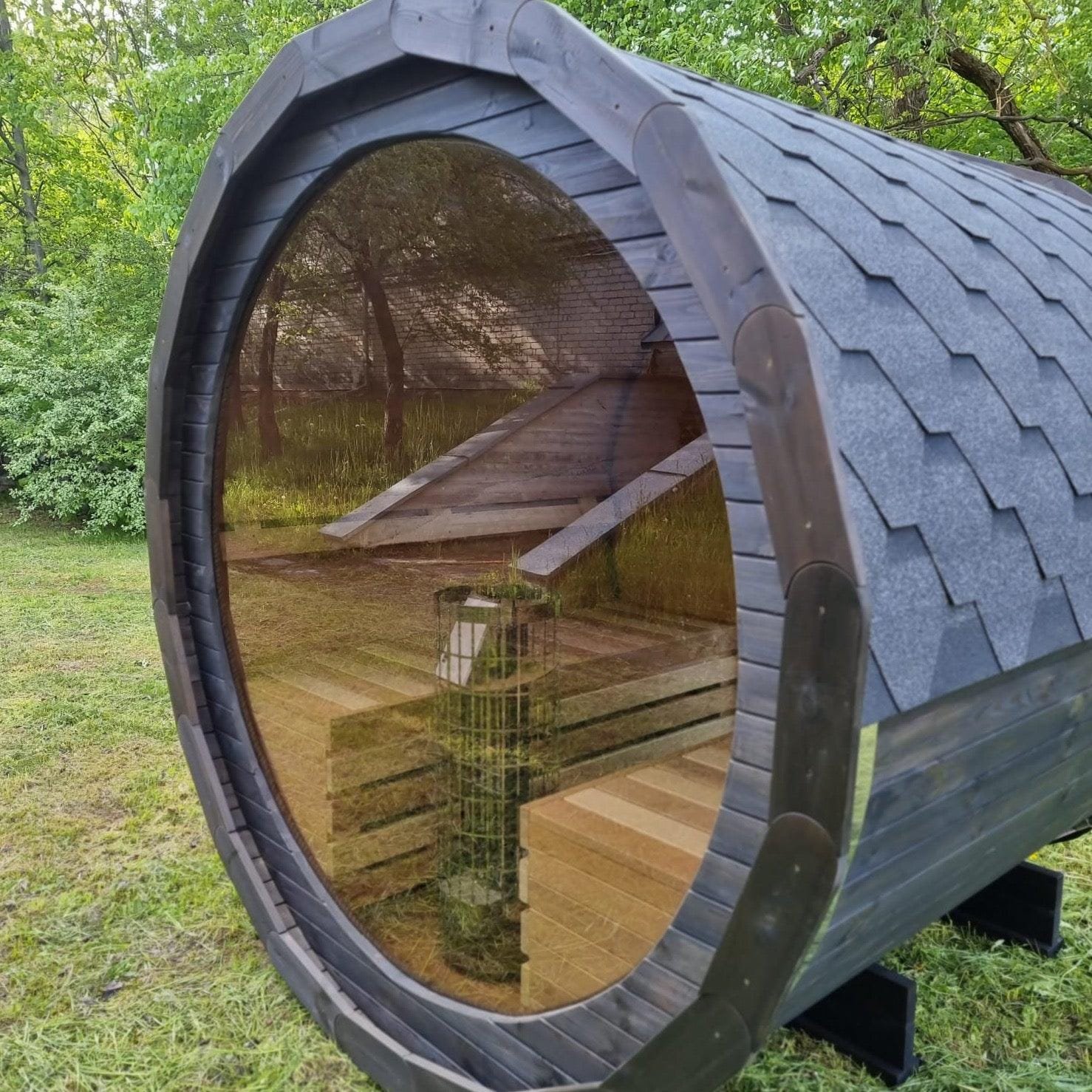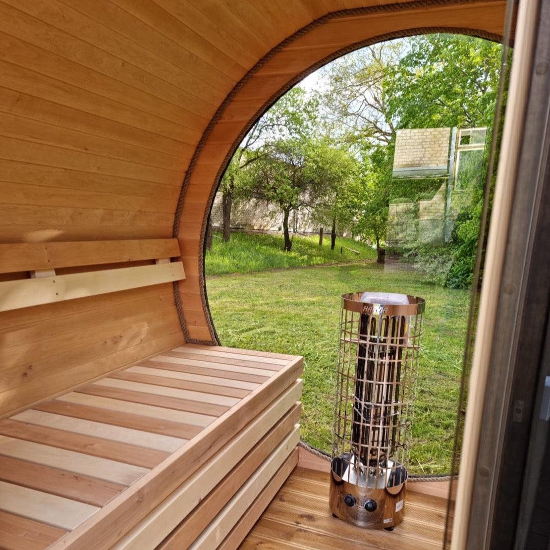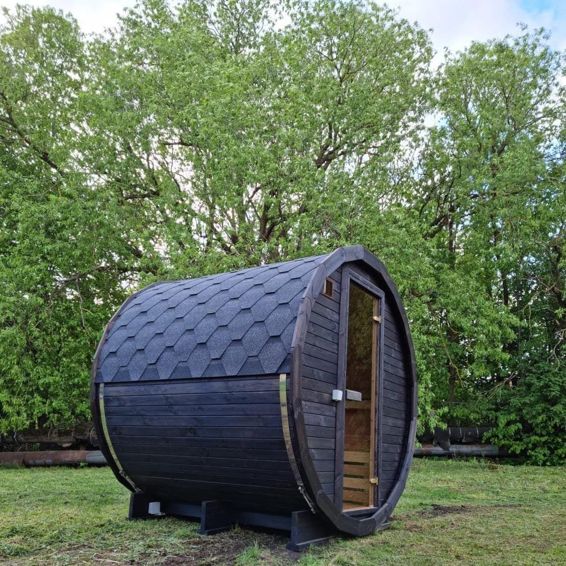 Made from sustainable Spruce timber either standard or thermo-treated (selectable in options) with roof shingles, glass door, various styles of back & front windows, Alder seating, outside terrace and wood treatment this is truly a wonderful sauna. Simplistic in design and very affordable.