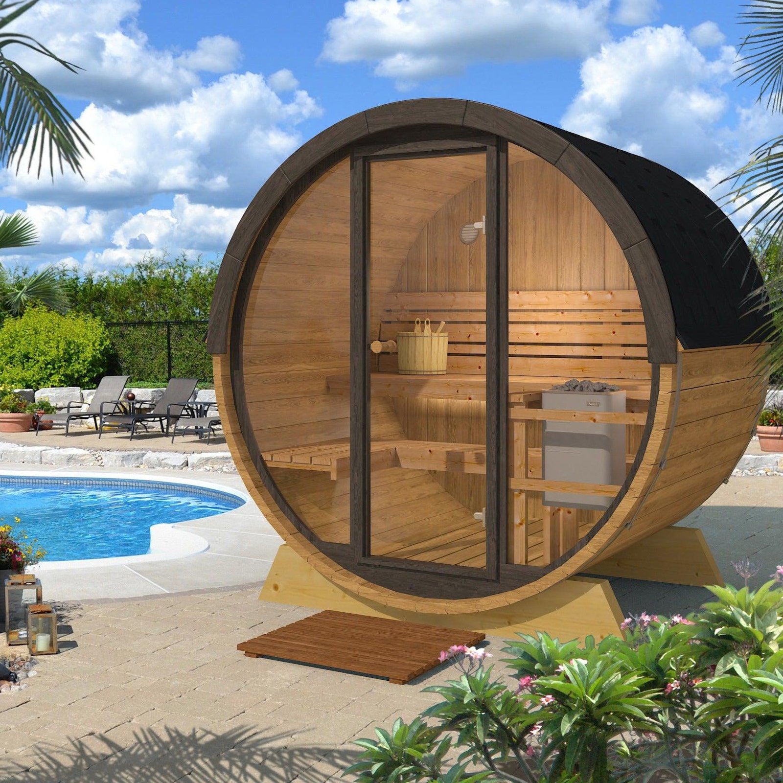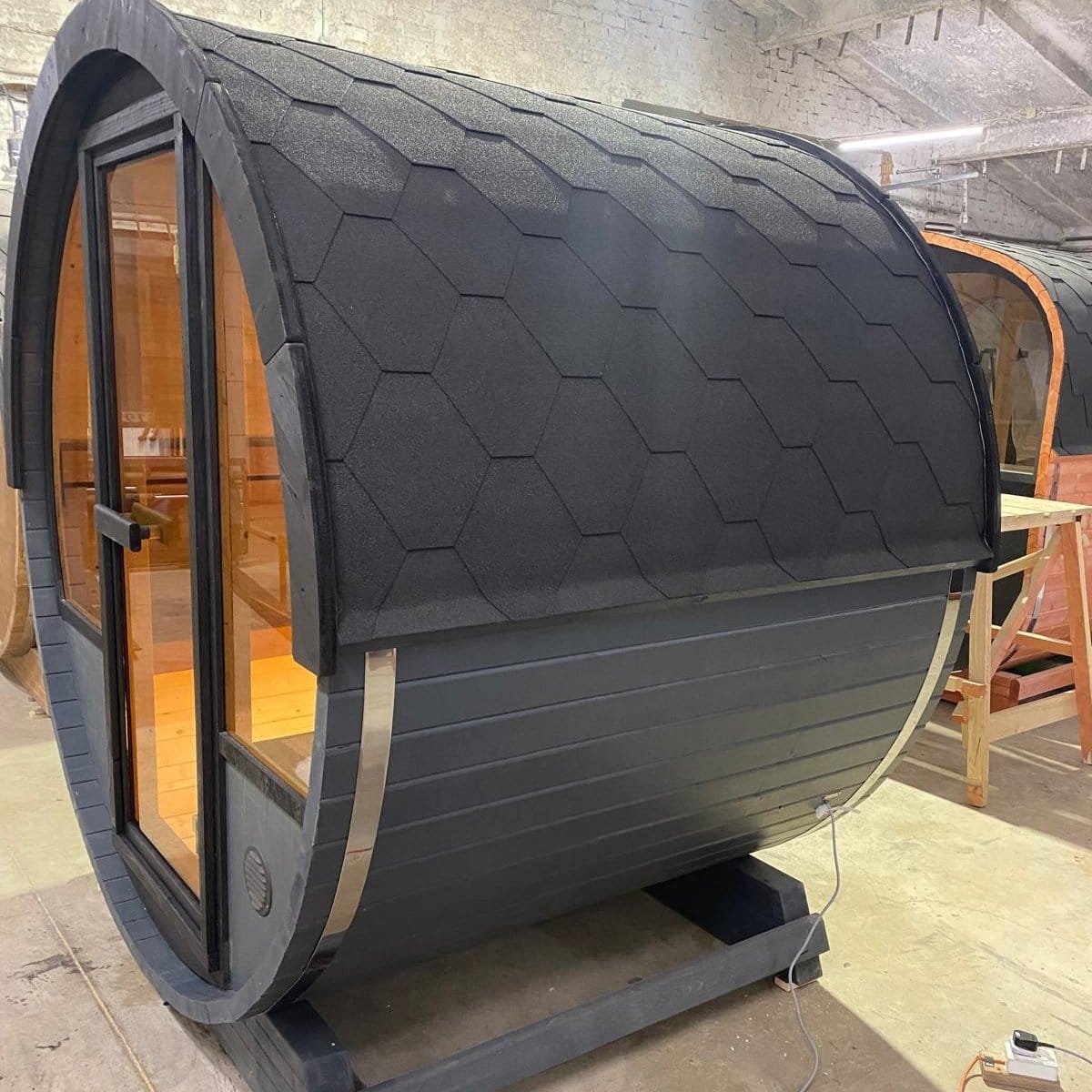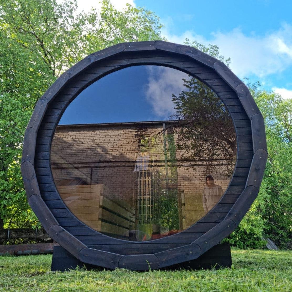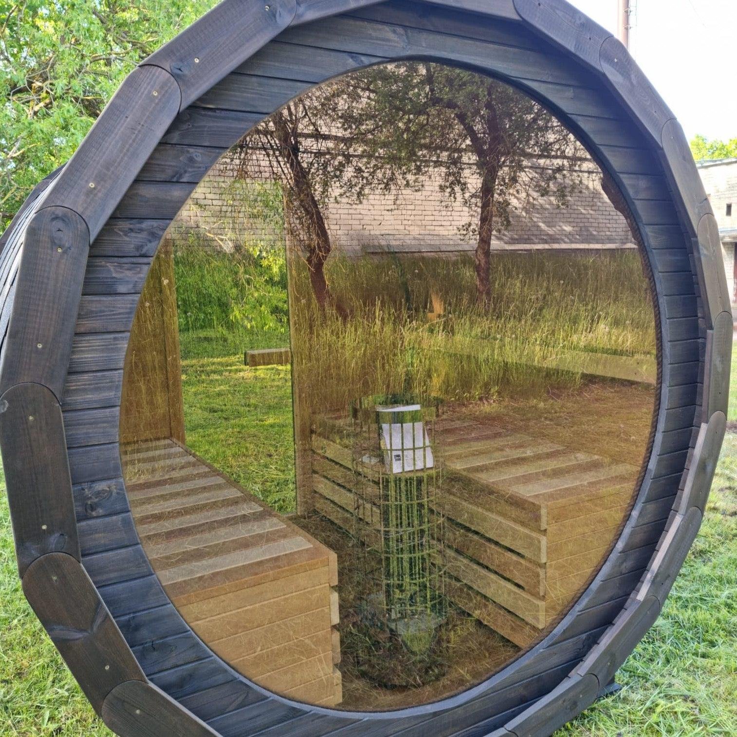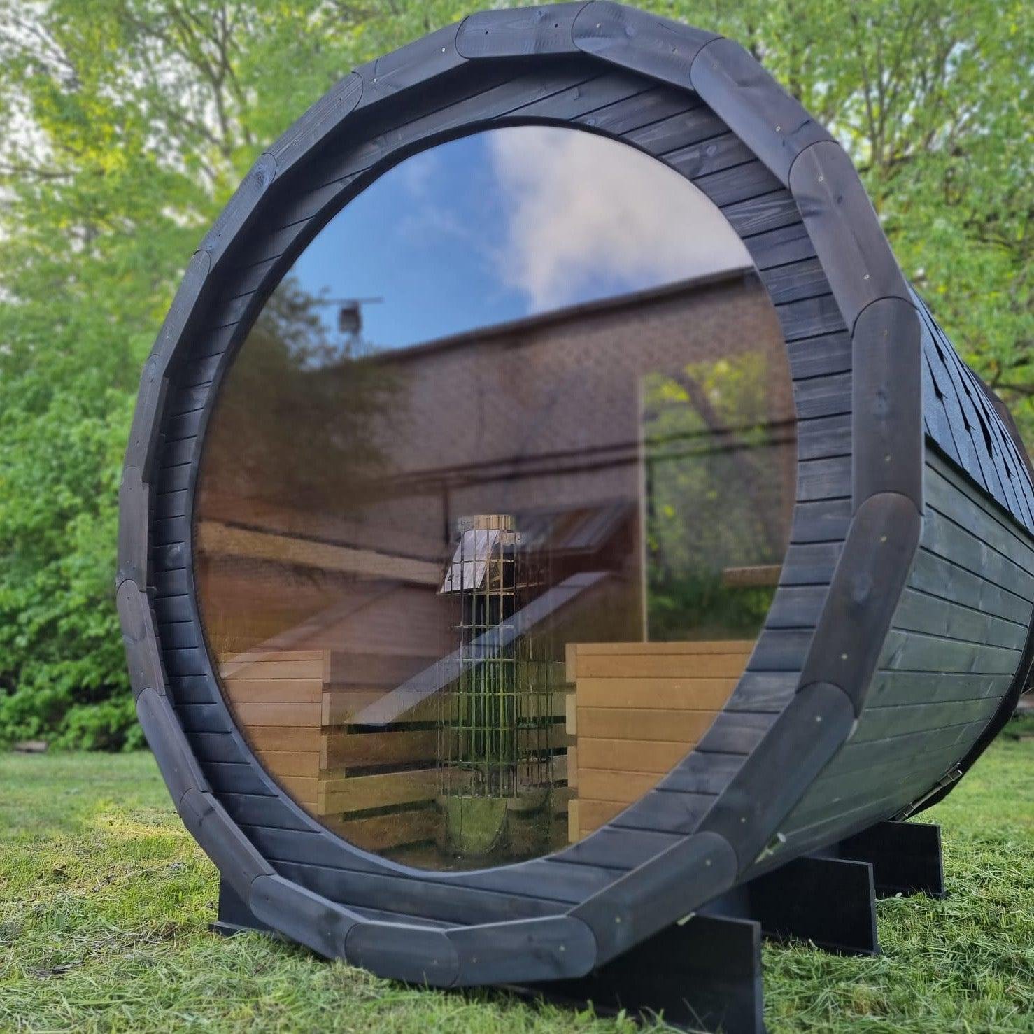 Made from sustainable Spruce timber either standard or thermo-treated (selectable in options) with roof shingles, glass door, various styles of back & front windows, Alder seating, outside terrace and wood treatment this is truly a wonderful sauna. Simplistic in design and very affordable.