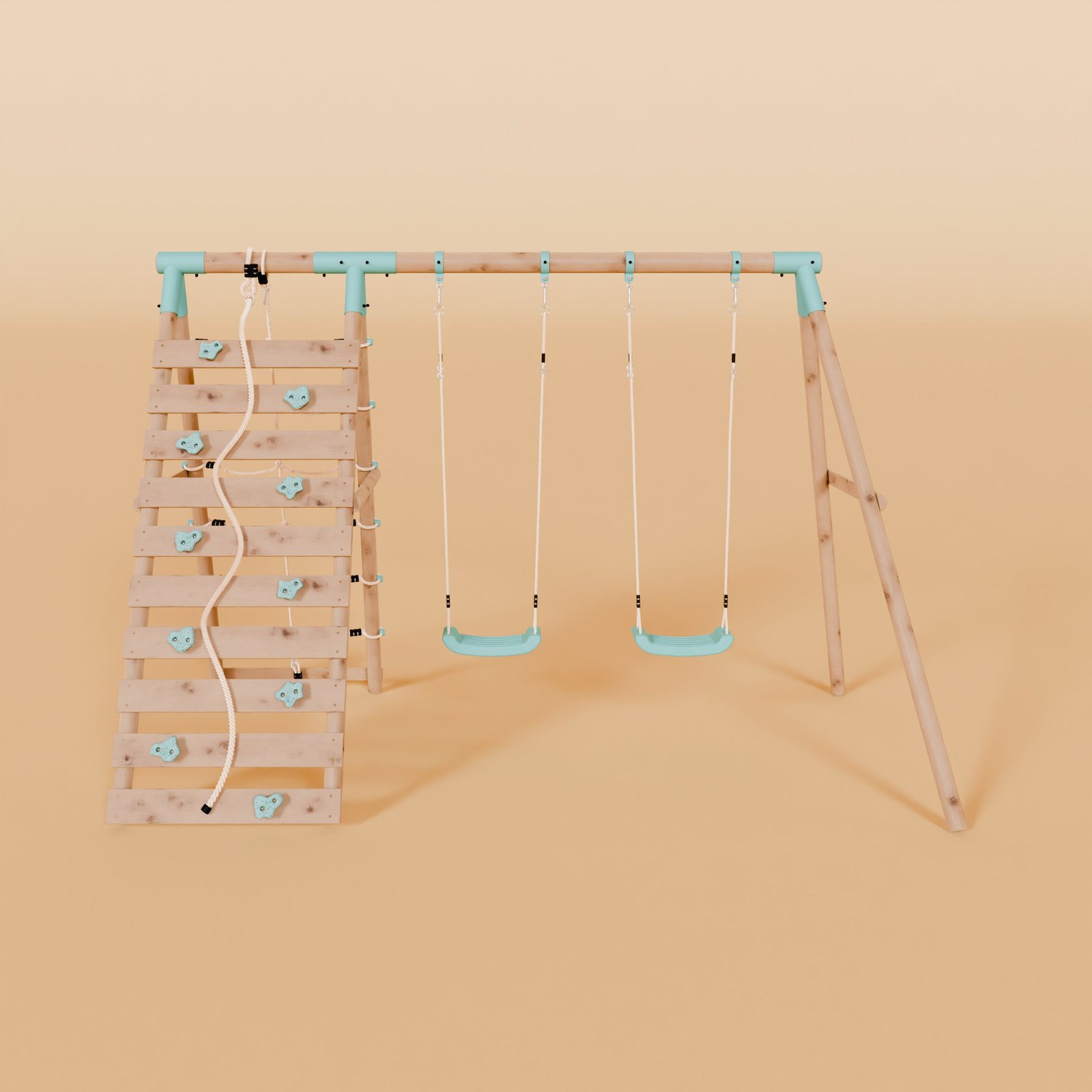 Two swing seats provide hours of fun for siblings or friends, encouraging shared play and social development. Alongside, a built-in climbing wall challenges young adventurers with timber slats, grip-friendly climbing holds, and a sturdy rope—perfect for building strength, balance, and confidence.