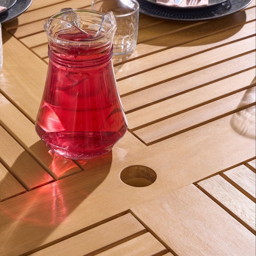 The Ashdown Folding 8 Seat Round Dining Set With Cushions comprises of a large round table with useful 50mm parasol hole, and eight chairs with comfortable seat pads.