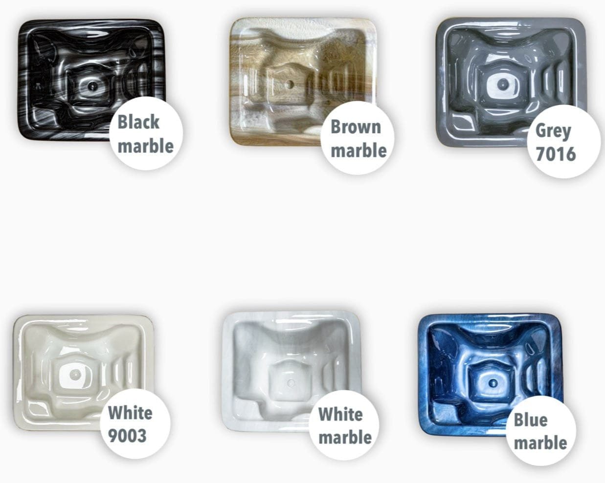 - Acrylic liner, (5 seats plus ‘hot bed’), various colours available with standard or marbled variants, selectable in the options, please enquire if unsure