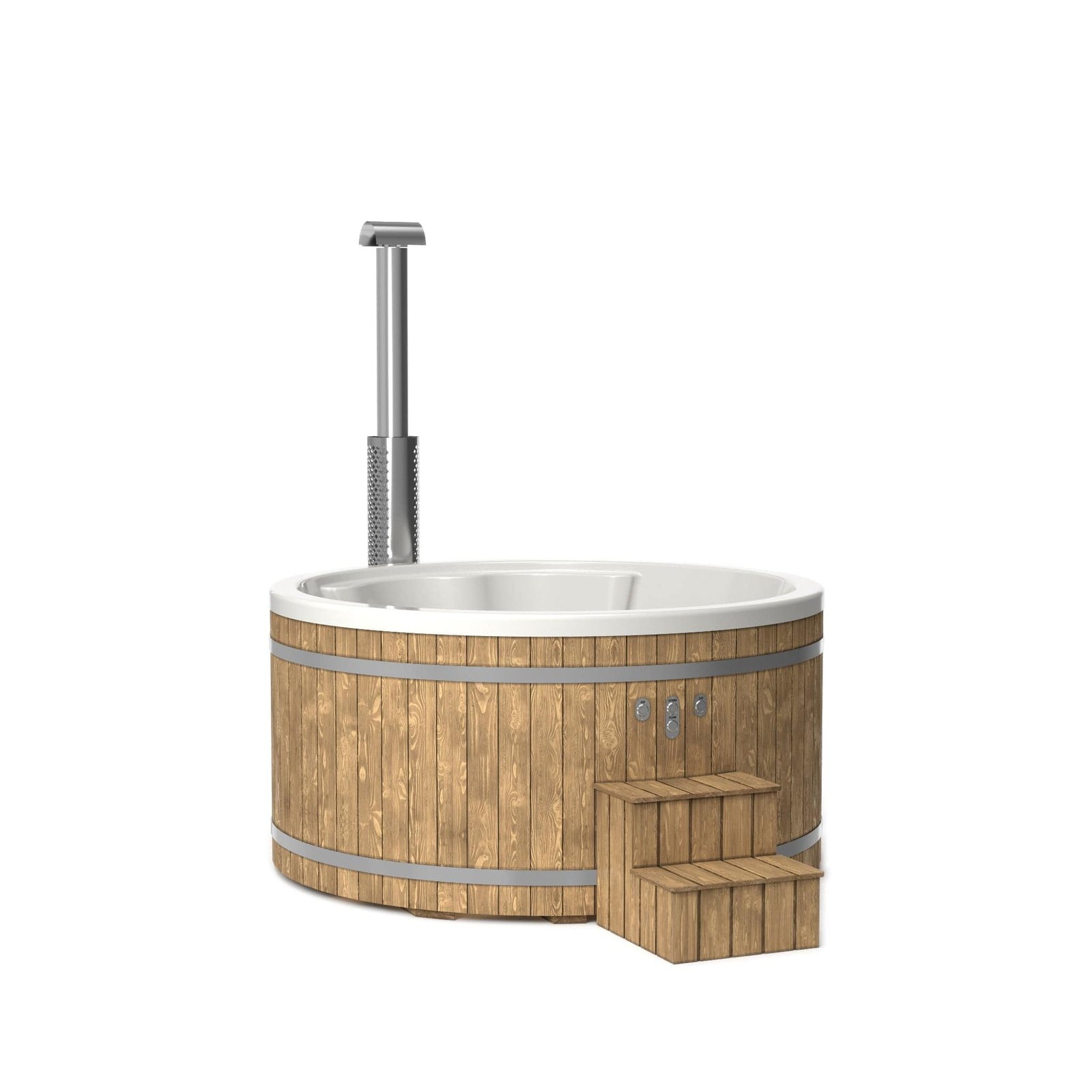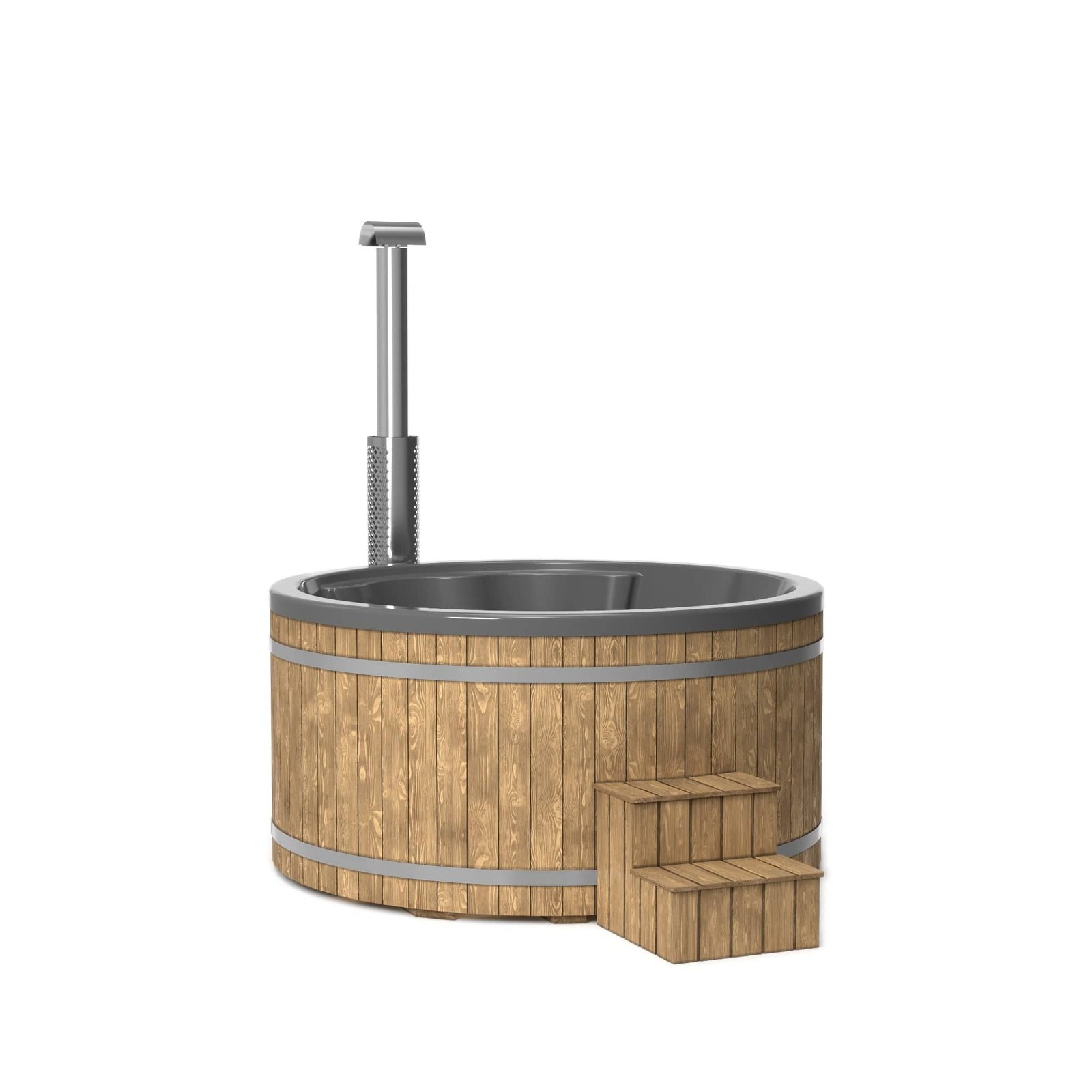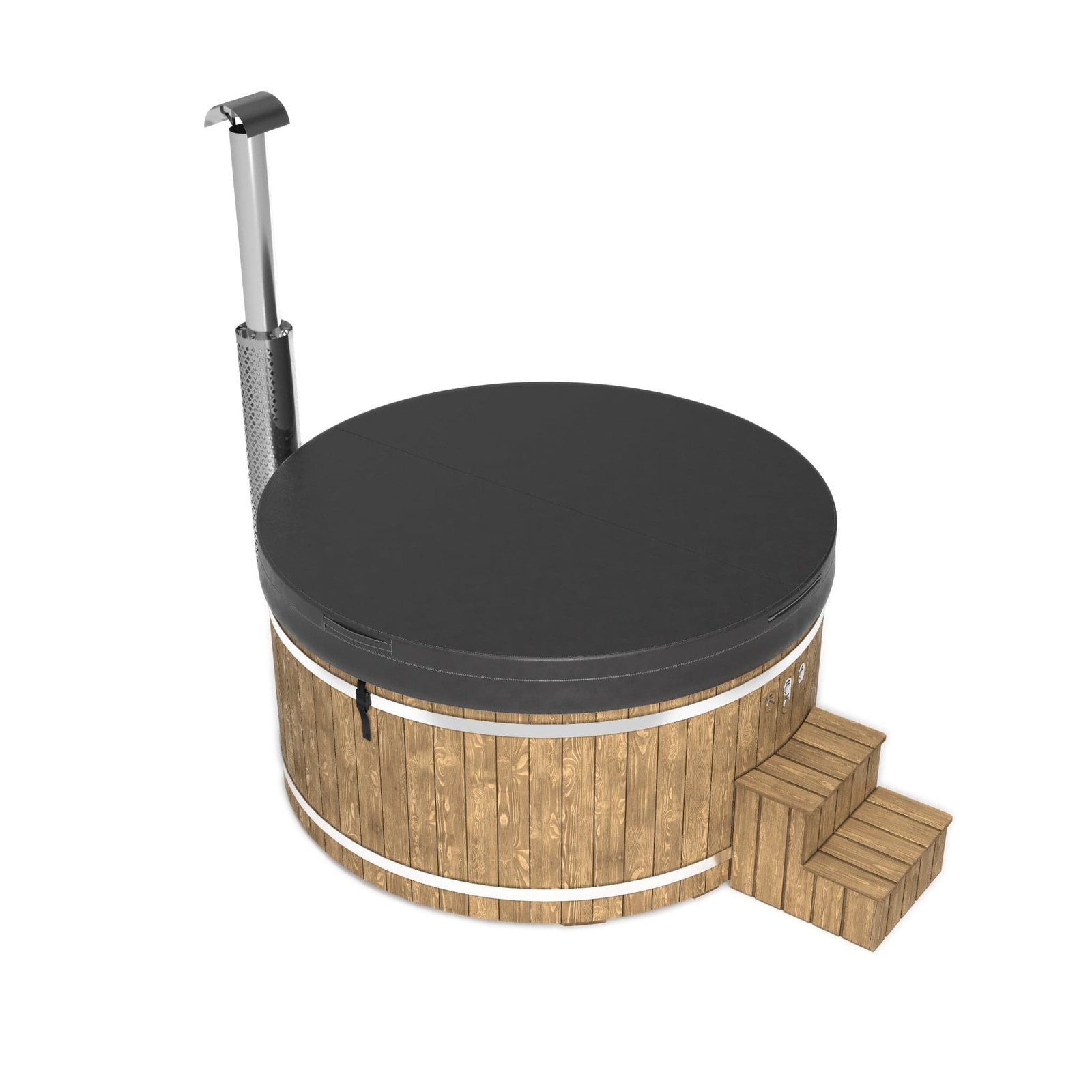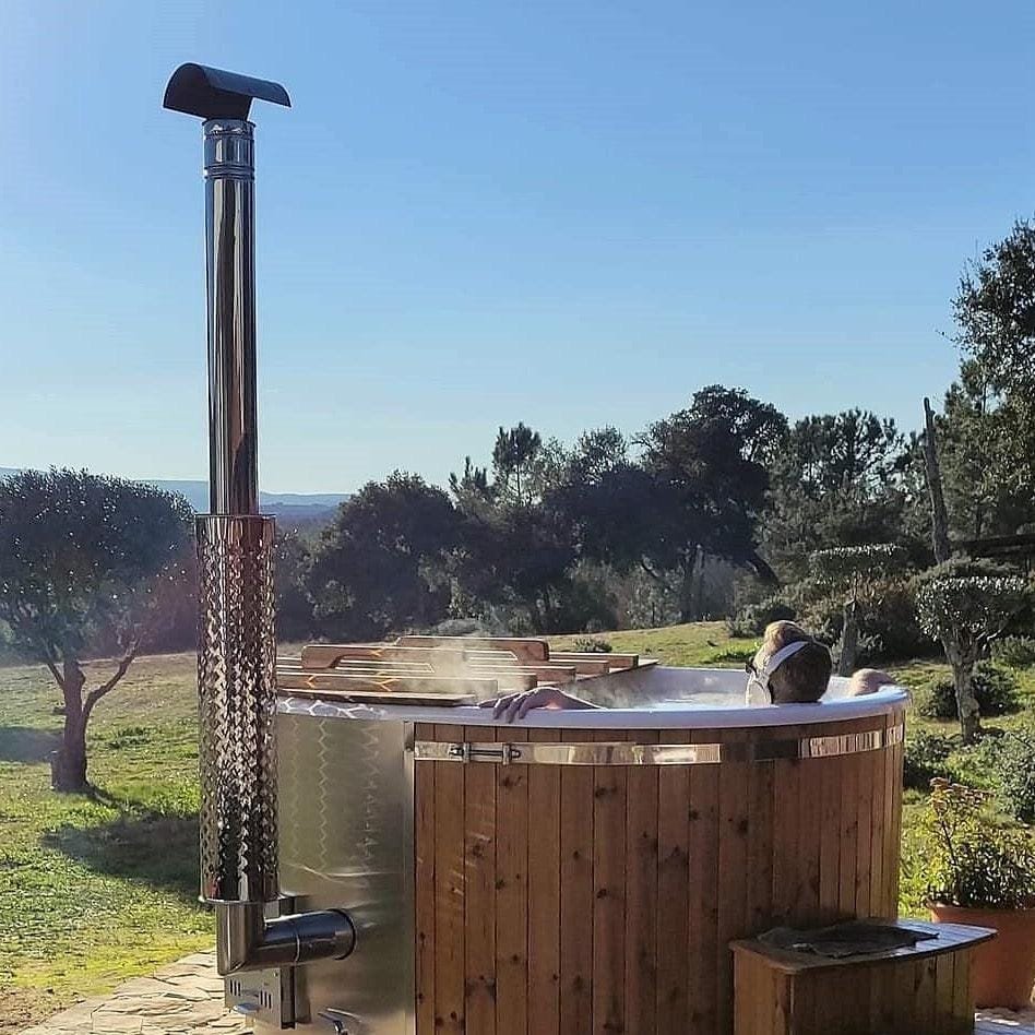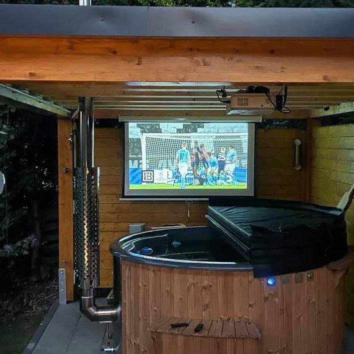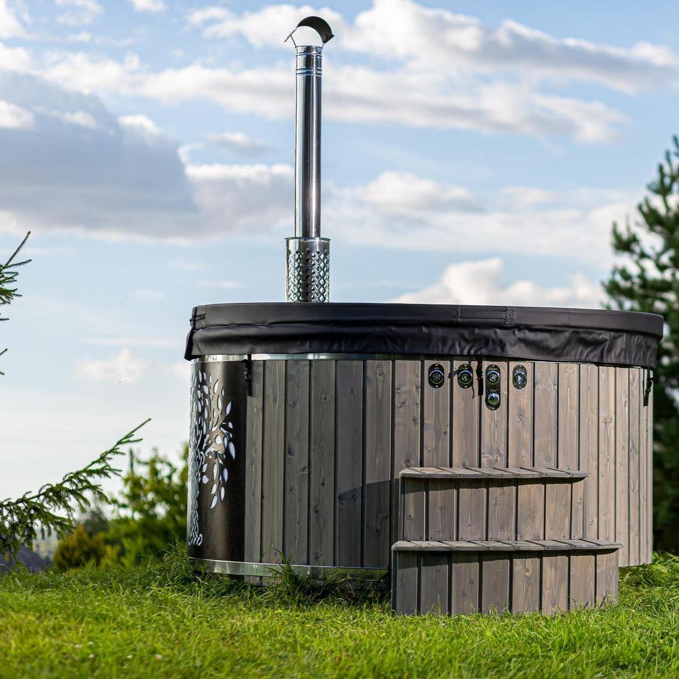 The “Henri” 200cm 4-8 person Scandinavian Spruce, thermowood or Composite clad, wood fired hot tub, with integrated heater, optional spa systems and other customisations.