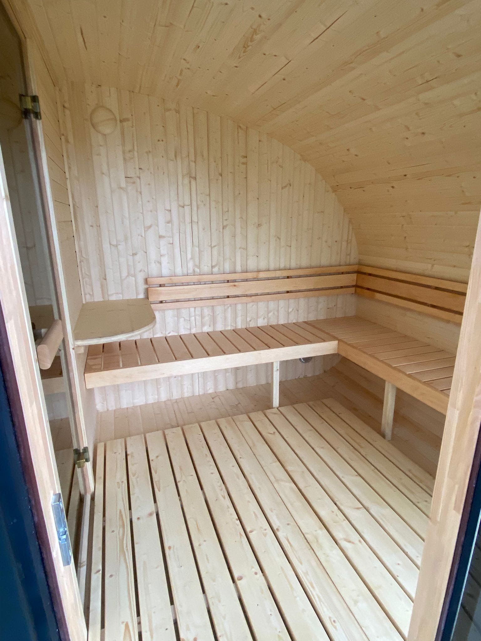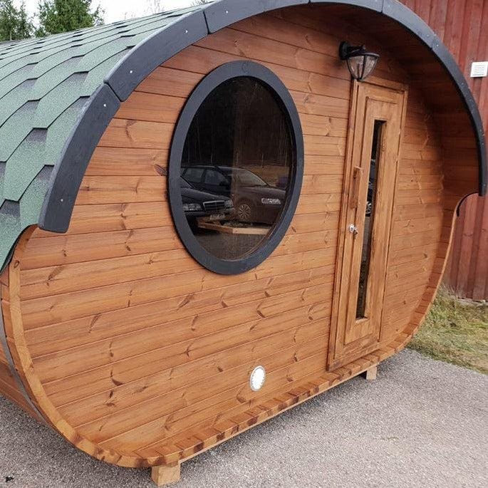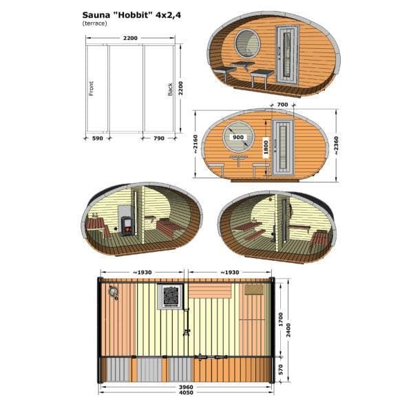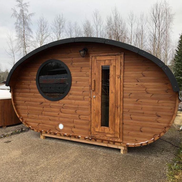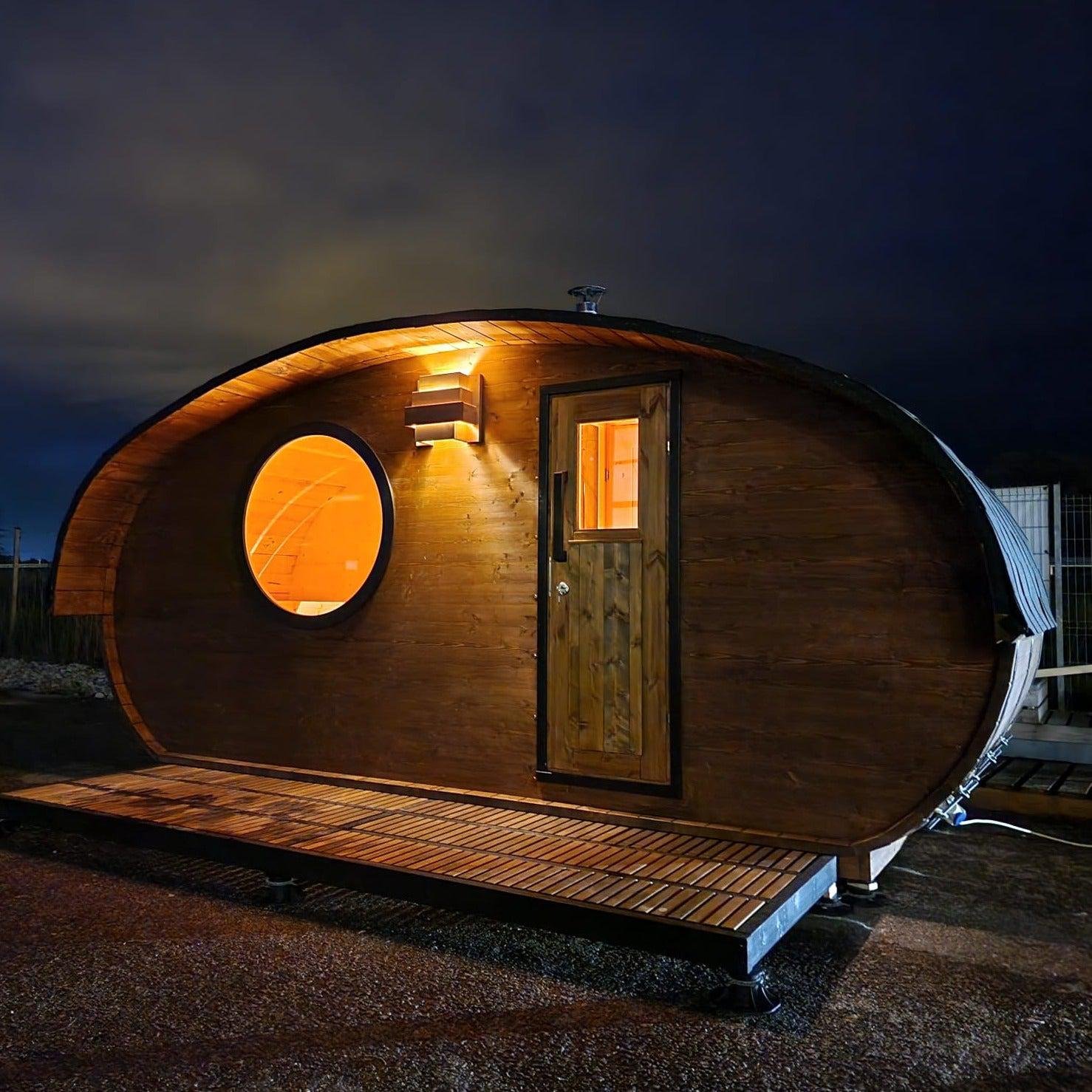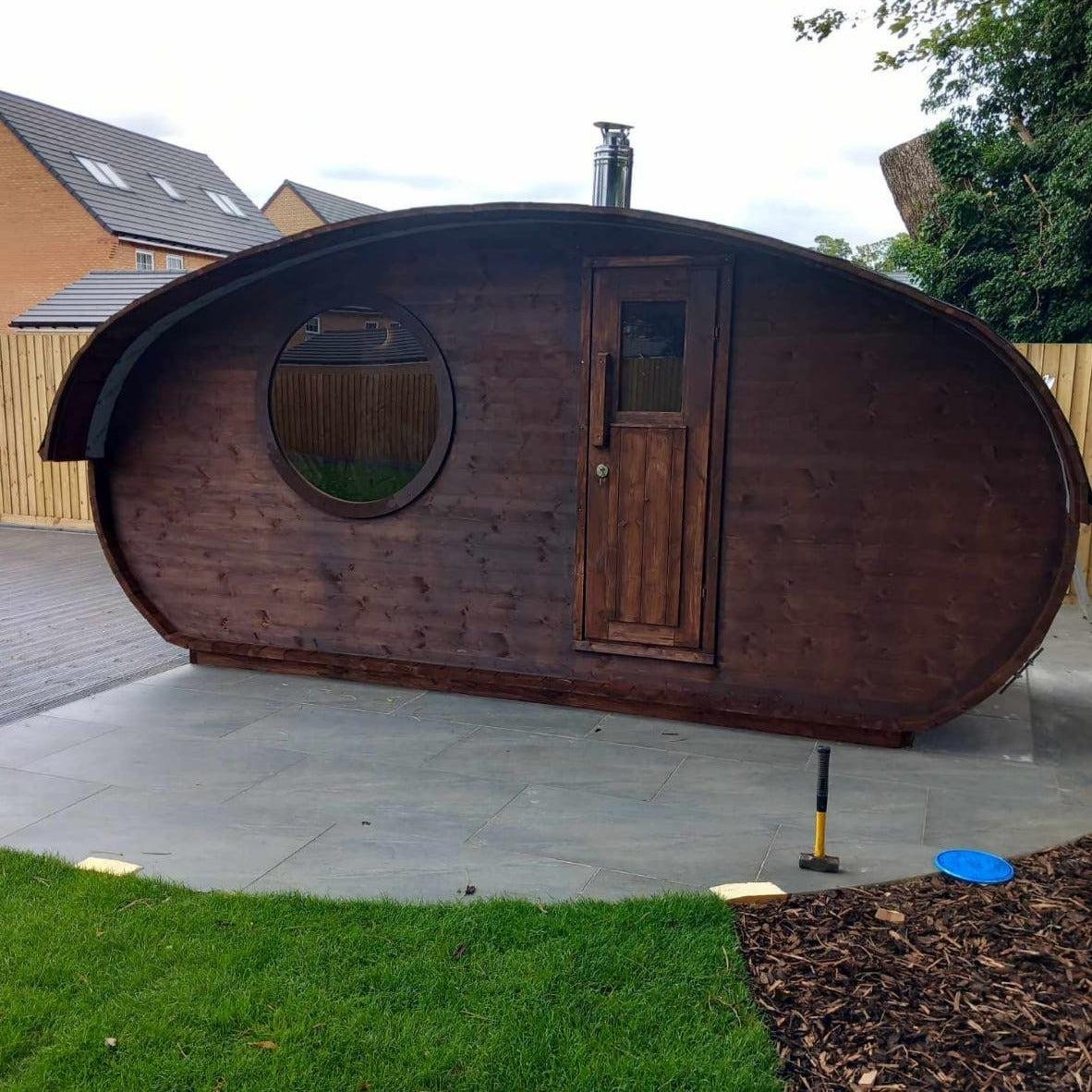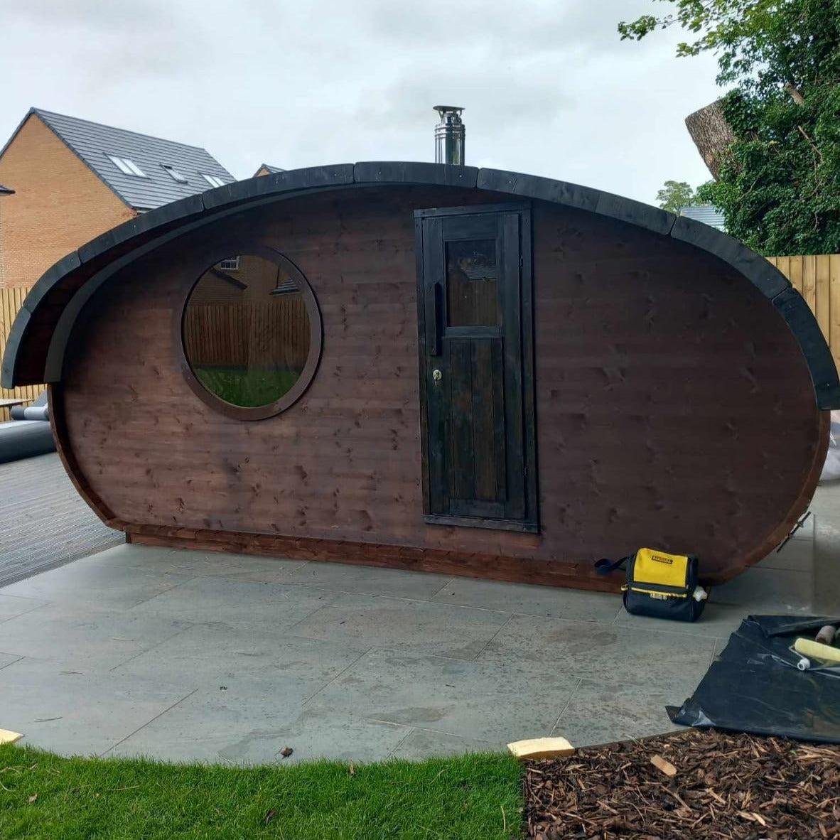 Our amazing Hobbit sauna is a real beauty, this cute and swanky sauna pushes the envelope of lavishness. Fitted with a top-quality Harvia heater; either wood-fired or electric, a front room with bench and table, main sauna room and an optional terrace.