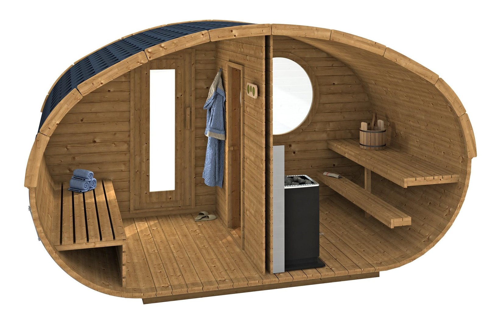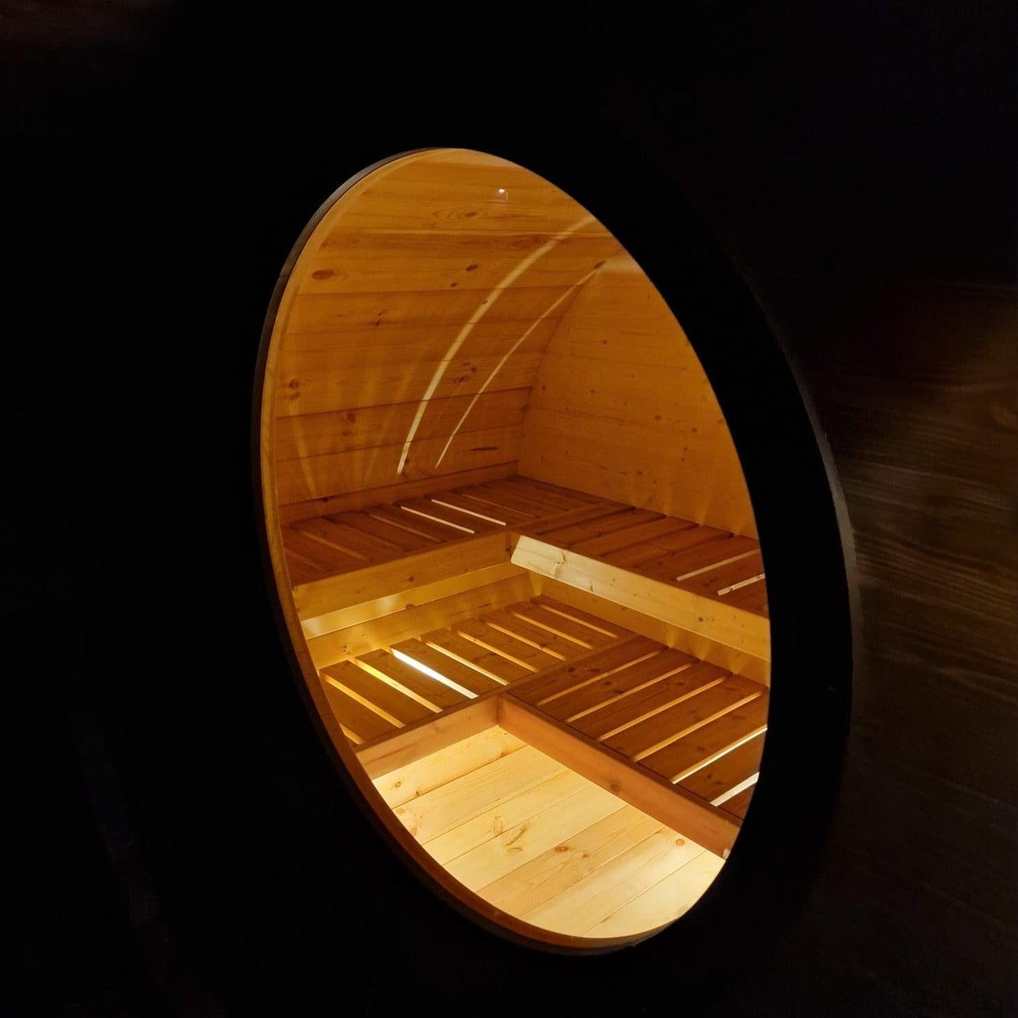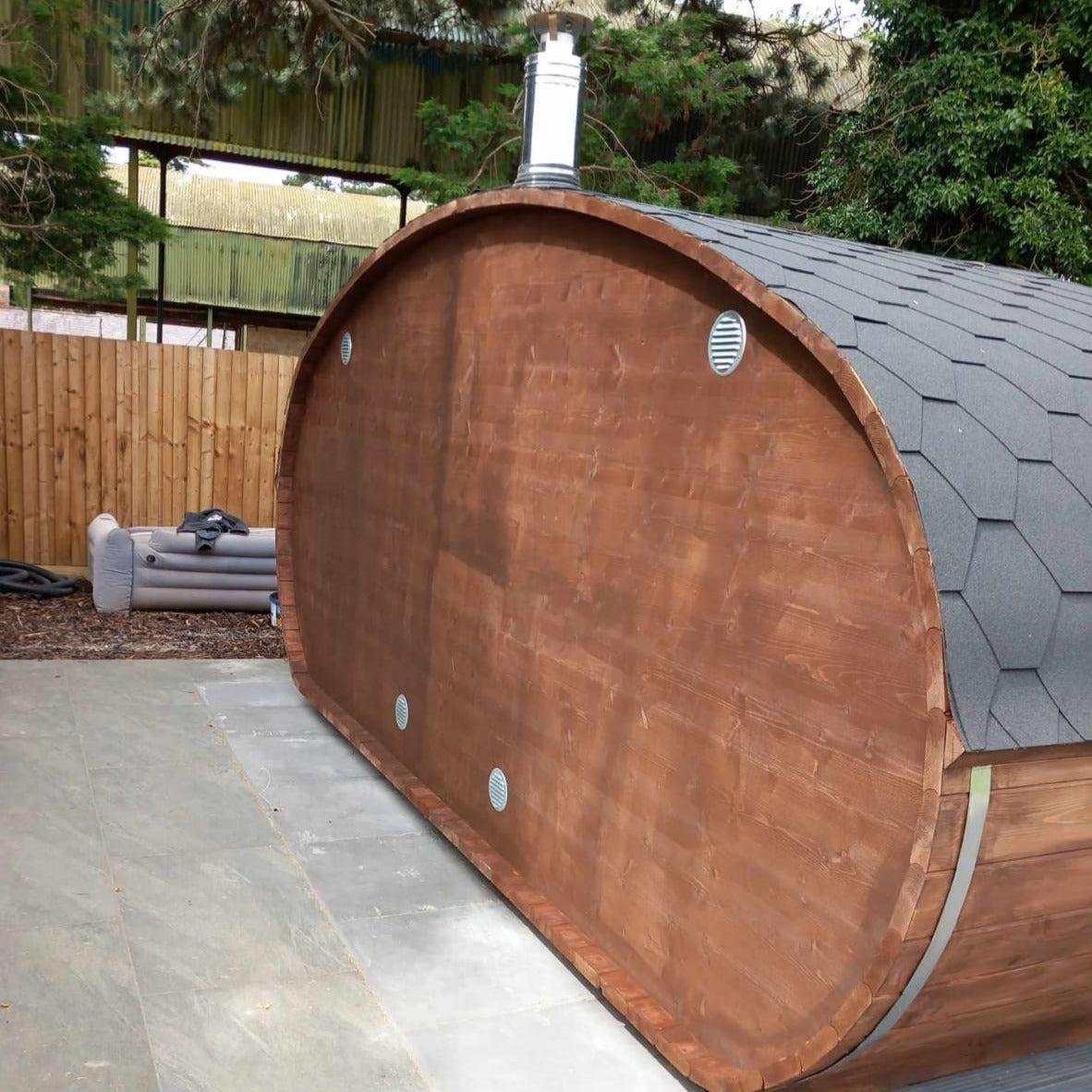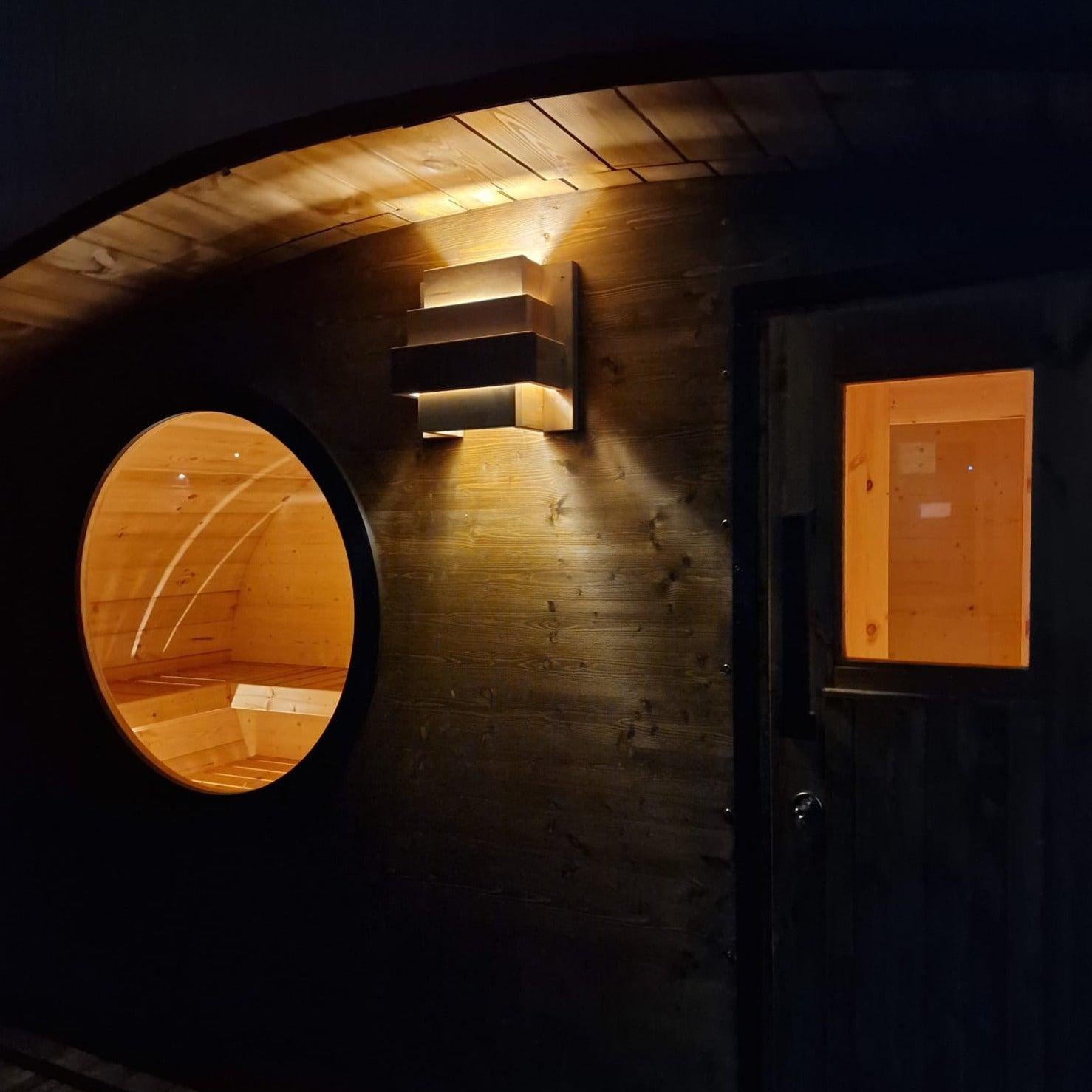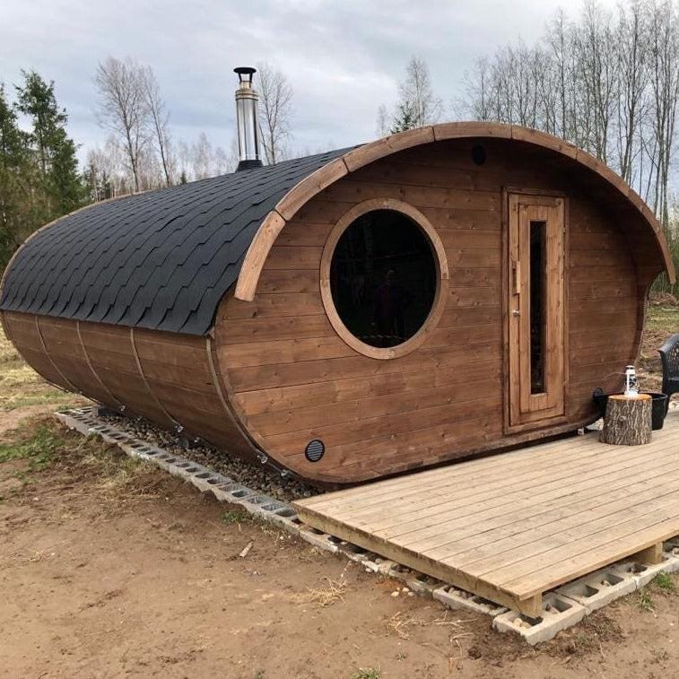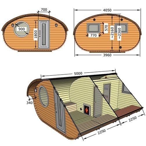 Our amazing Hobbit sauna is a real beauty, this cute and swanky sauna pushes the envelope of lavishness. Fitted with a top-quality Harvia heater; either wood-fired or electric, a front room with bench and table, main sauna room and an optional terrace.