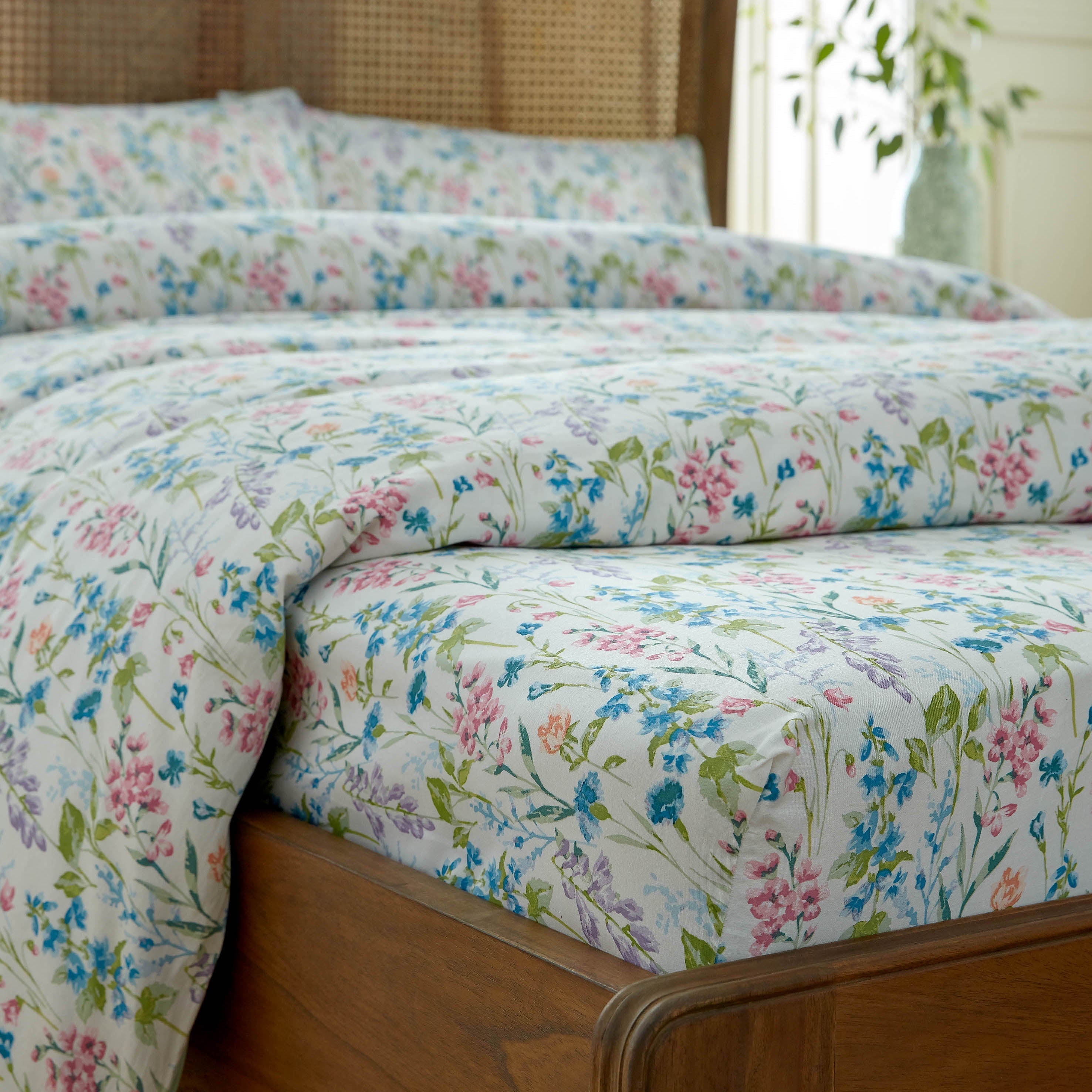 Elston Garden features a vibrant watercolour design of stylised British wildflowers such as harebells and cornflowers. Crafted from premium 100% cotton sateen with a 220 thread count, this ditsy fitted sheet brings a fresh, summery palette to your bedroom, seamlessly blending indoor comfort with outdoor charm. It is available in single, double, king, and super king sizes.
