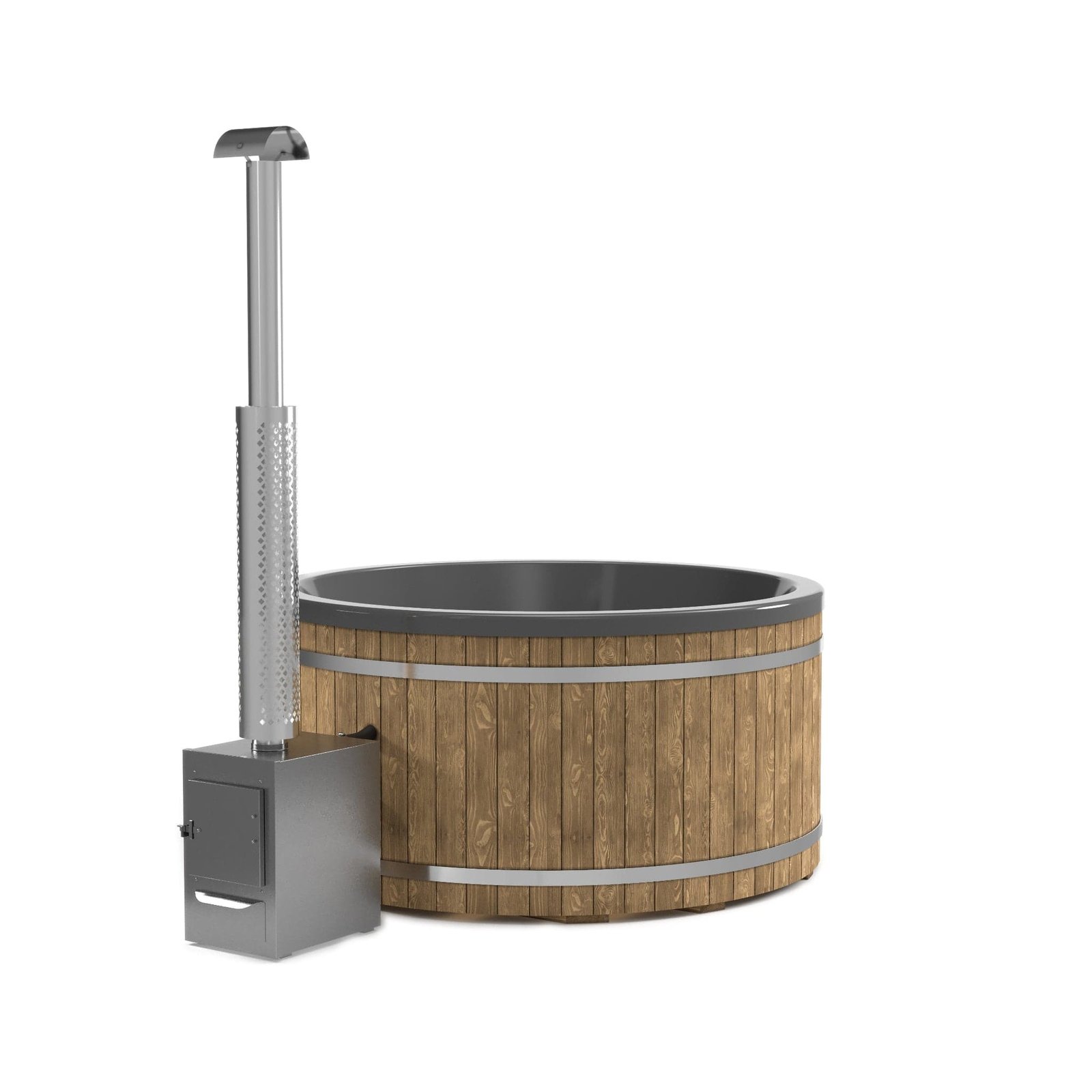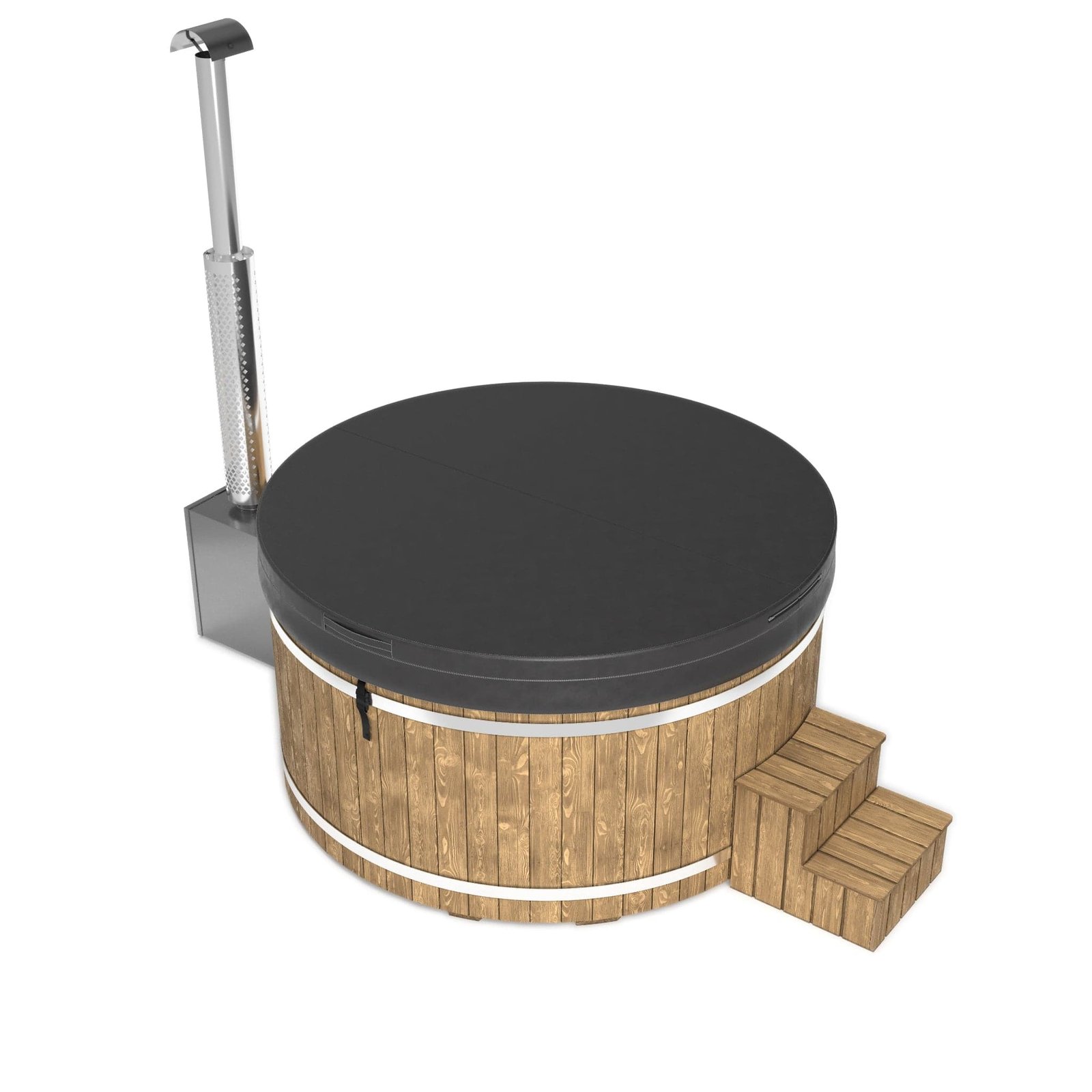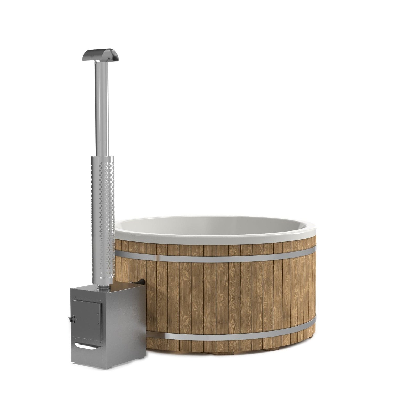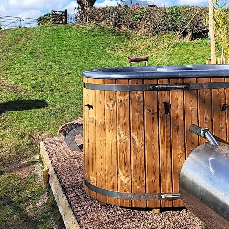 The “René” 200cm 4-8 person Scandinavian Spruce, thermowood or Composite clad, wood fired hot tub with external heater, optional spa systems and other luxurious extras.