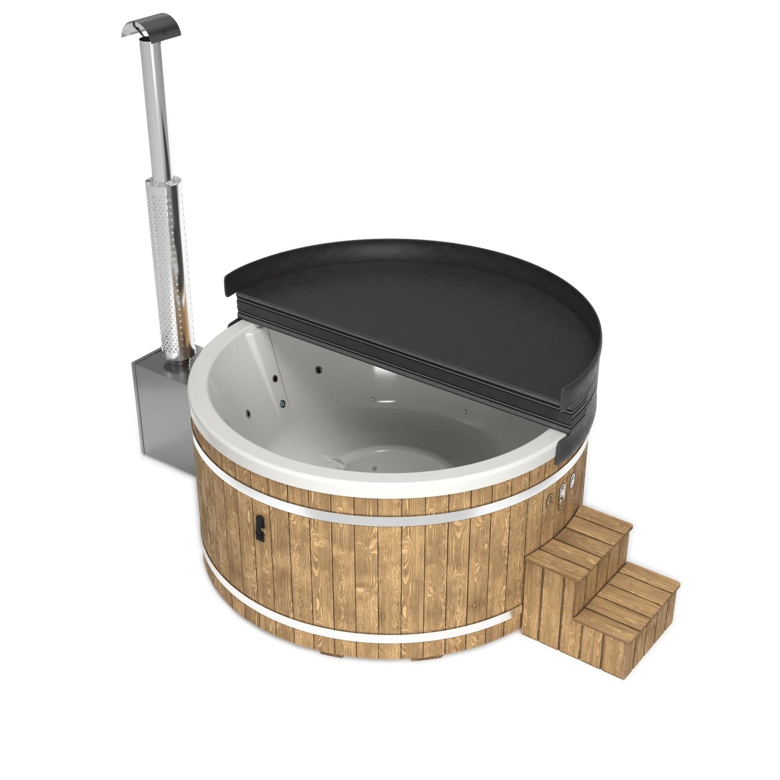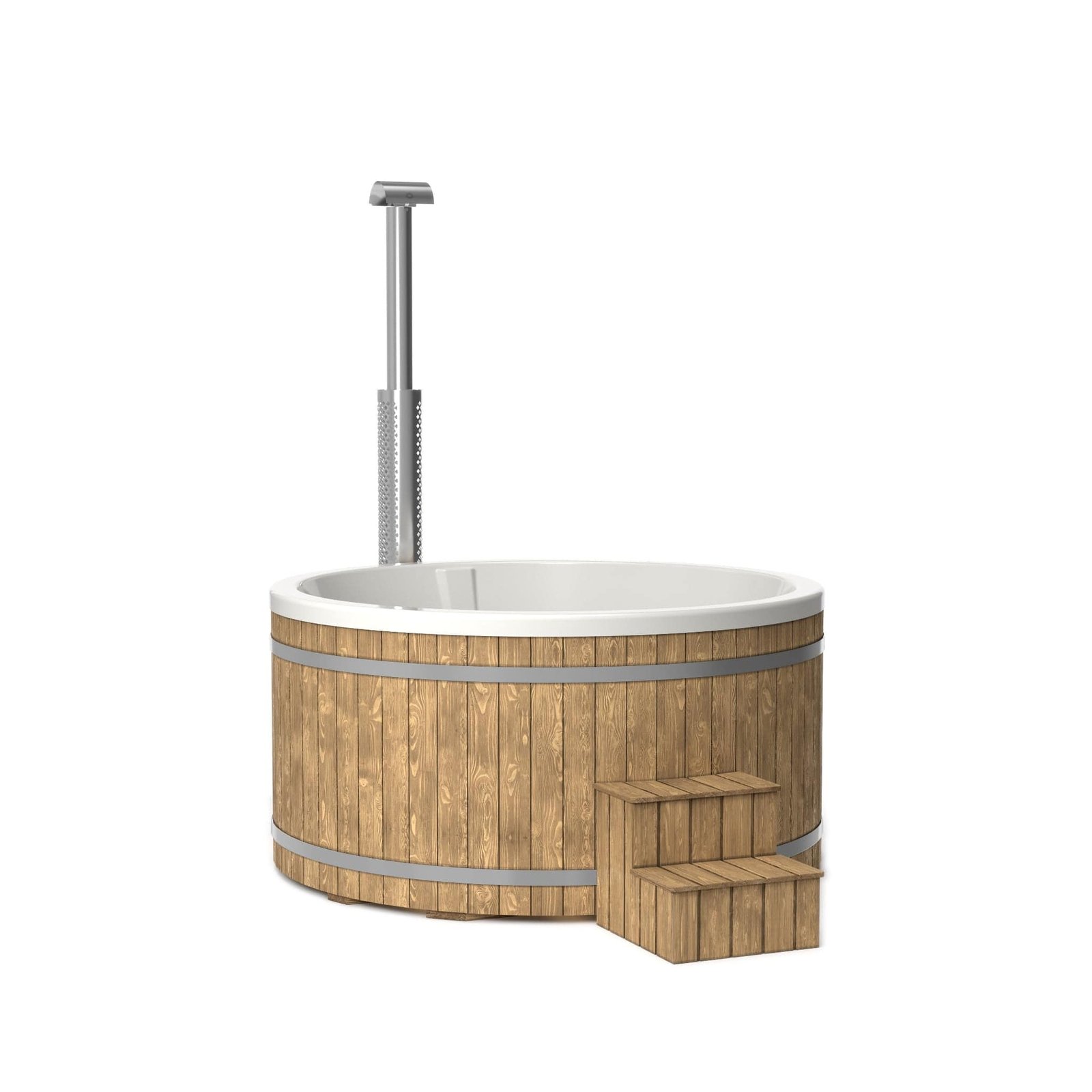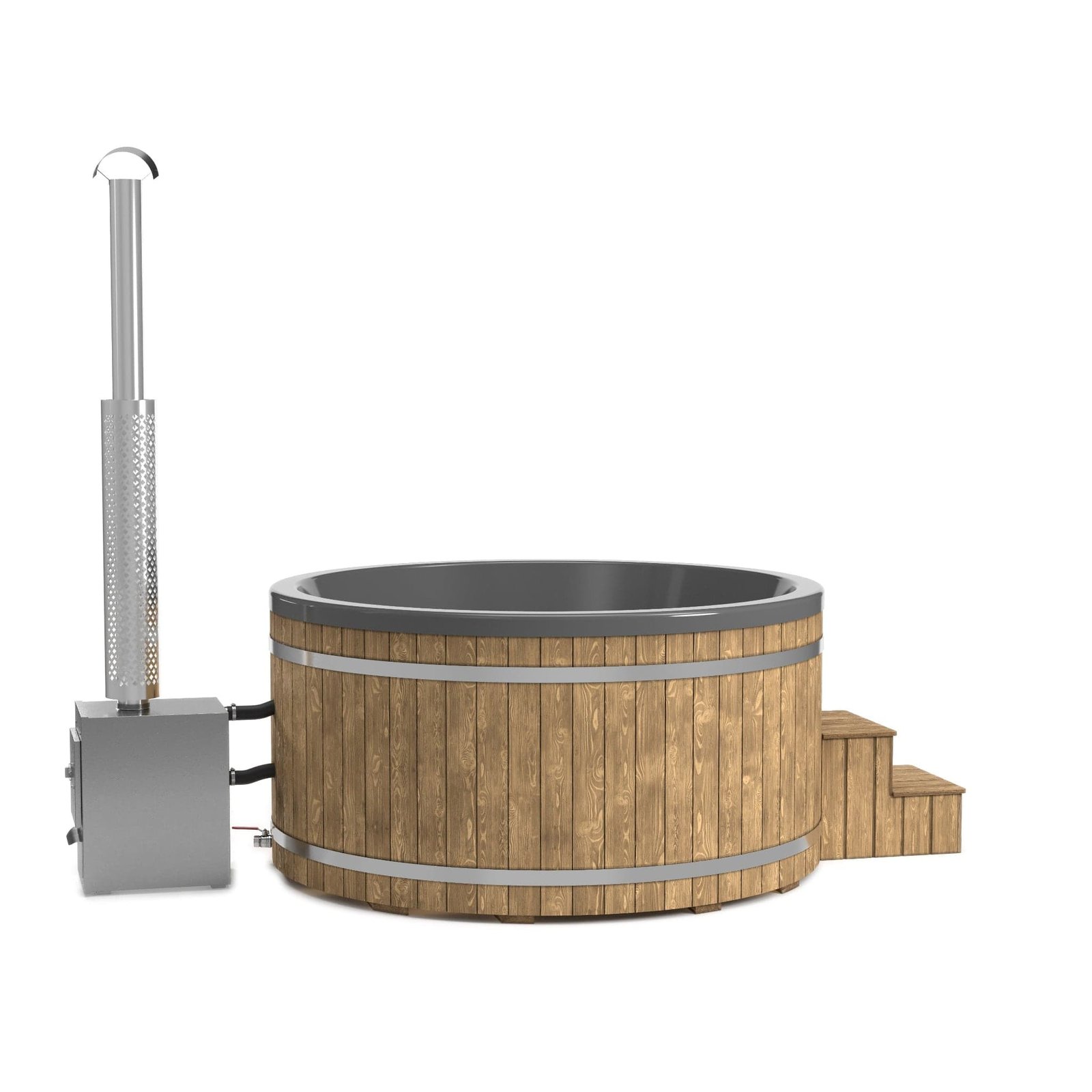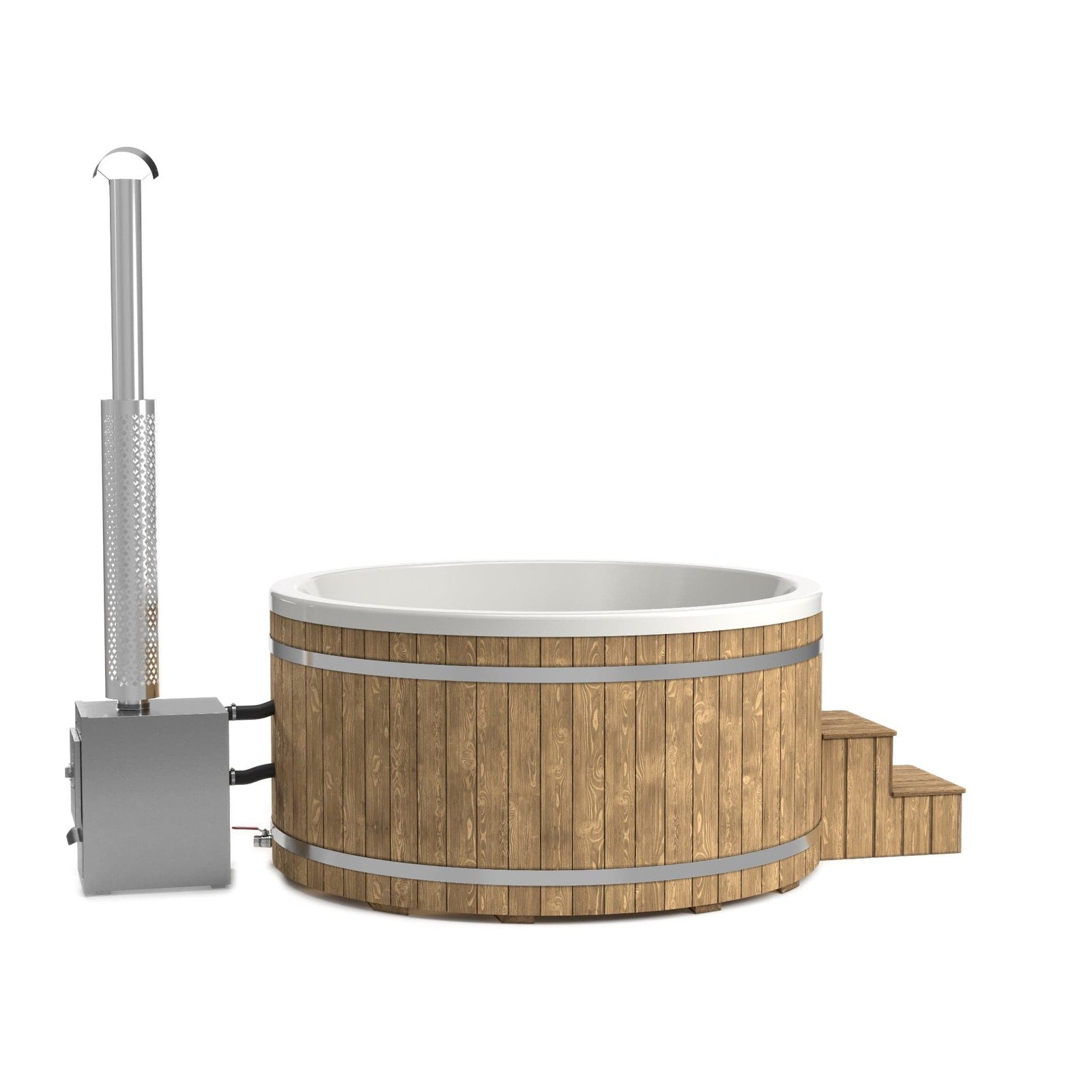 The “René” 200cm 4-8 person Scandinavian Spruce, thermowood or Composite clad, wood fired hot tub with external heater, optional spa systems and other luxurious extras.