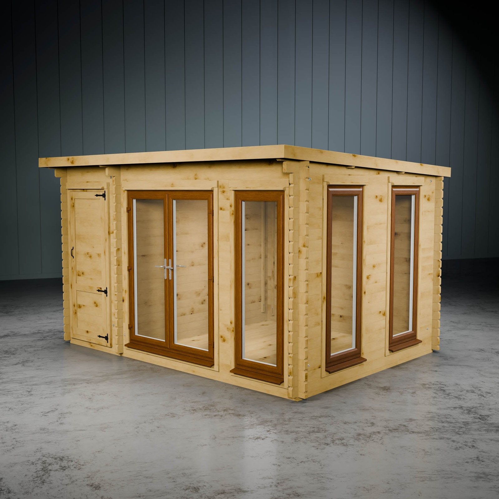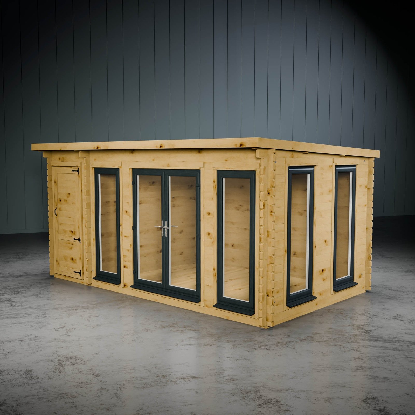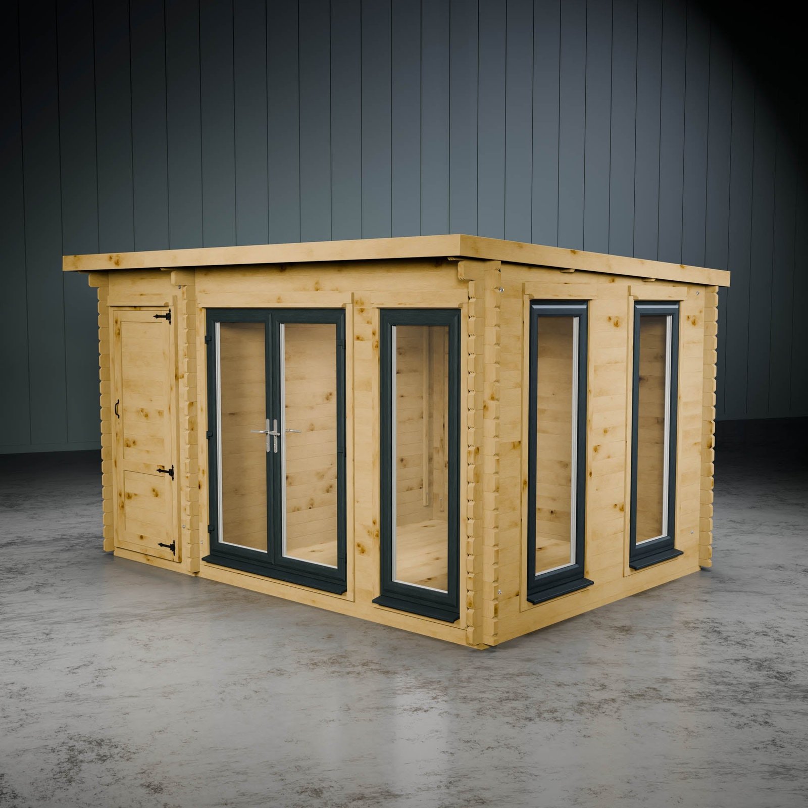 If you fancy upgrading this cabin and taking it to the next level, the Wren log cabin with side shed is also available with UPVC doors and windows. Choose from anthracite, oak and white.